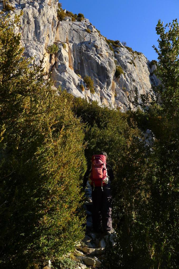 Comenzamos a andar directamente hacia el N, superando un murete de piedra de separación de campos, e inmediatamente nos topamos con la senda que sube a la fuente de Sala (1295m 0h04′). Avanzamos por senda con fuerte pendiente entre un bosque de bojes hasta enlazar con el camino que viene de la bifurcación Bestué-Escuaín (1415m 0h22′). El día es tan caluroso que subimos con camiseta de manga corta.