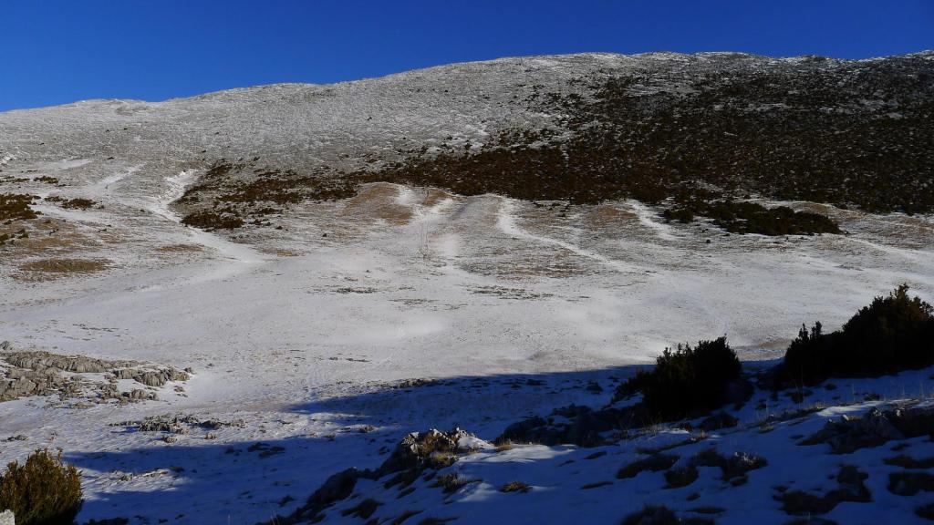 El descenso lo hacemos directo hasta la vaguada central (1790m 4h28′), siguiendo fácilmente numerosos hitos; atravesando la vaguada volvemos a recorrer la senda de subida hasta el aparcamiento (1260m 5h17′)