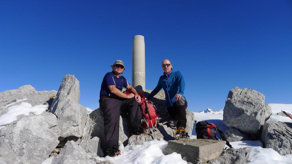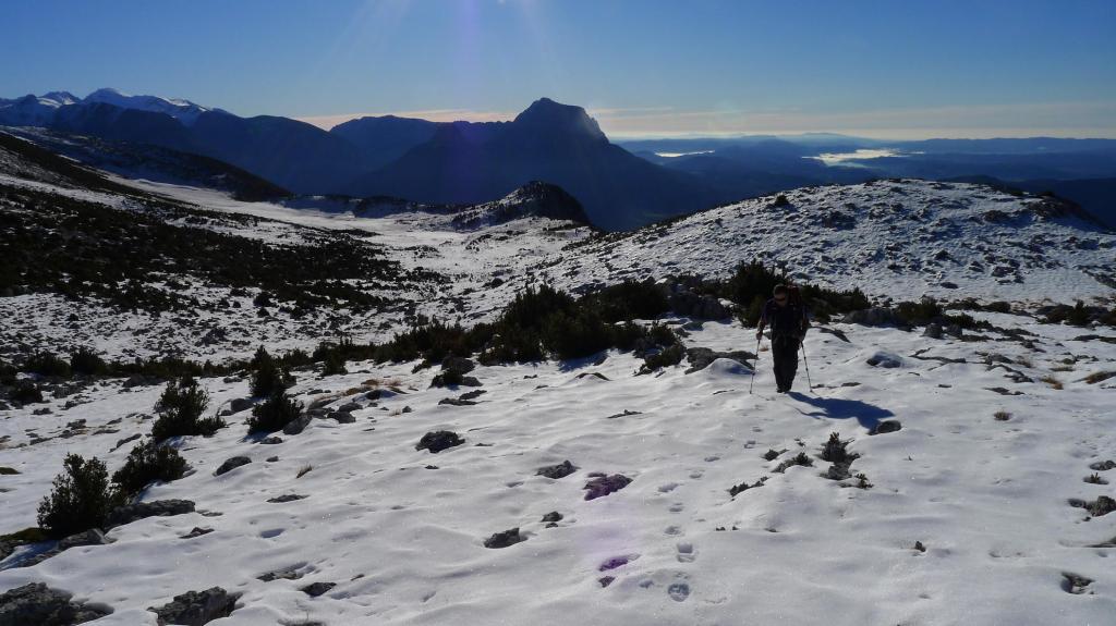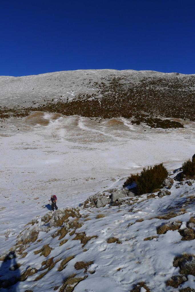 Media vuelta, por tanto, y a continuar en dirección ESE hasta la cima principal de Castillo Mayor (2014m 3h33′), con nieve algo más profunda e incómoda porque tapa un karst agujereado impidiendo ver los huecos entre la roca.