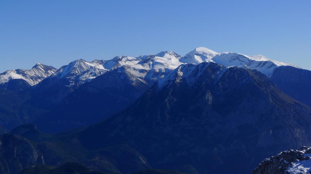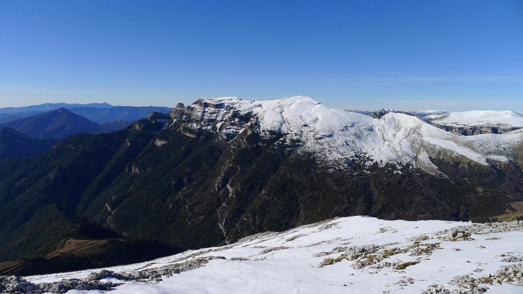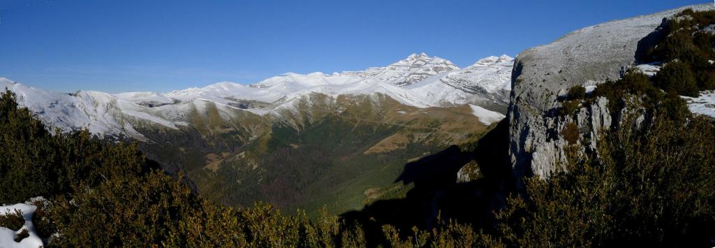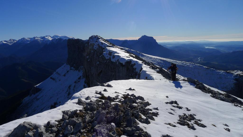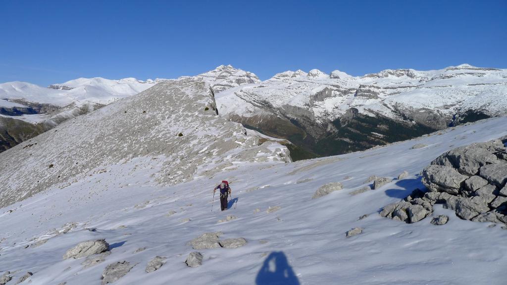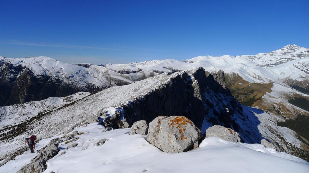 Está nevada, con nieve brillante, se anda bien. Vamos a nuestra izquierda, hacia la estribación occidental, por donde iremos girando a la derecha para llegar a la cresta norte (1955m 2h10′). Seguiremos la cresta hacia el oeste para acceder a la punta más occidental, Peña l’Ombre 1989m 2h26′). Se observa toda la cresta hasta la punta de Castillo Mayor, con su vertiginosa caída vertical hacia el río Yaga y la garganta de Escuaín.