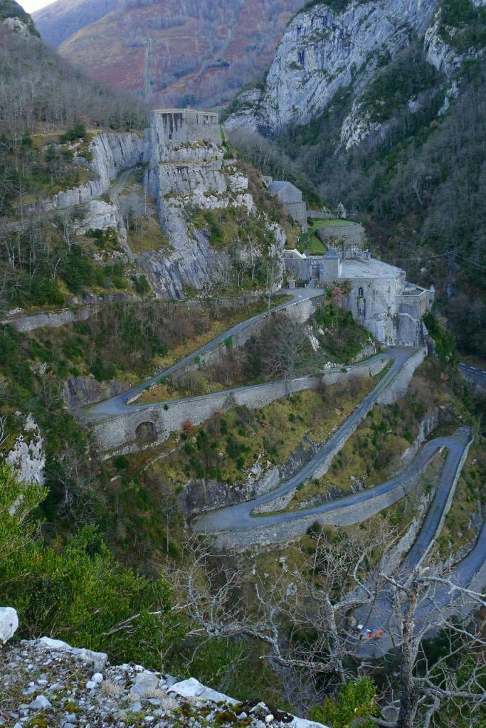 Se sigue la pista hacia el S que nos asoma al fuerte del Portalet, y entonces gira a la izquierda para introducirnos en les Gorgues de l’Enfer. Esta es la parte más impresionante ya que vamos a media altura por la pared, con una vertical caida hacia el río, a nuestra derecha; sin embargo el camino es excelente y no presenta peligro alguno. Poco a poco entramos en zona de más vegetación, la garganta se abre, y se llega a unas cabañas, la Grange Perry (1120m 0h49′).