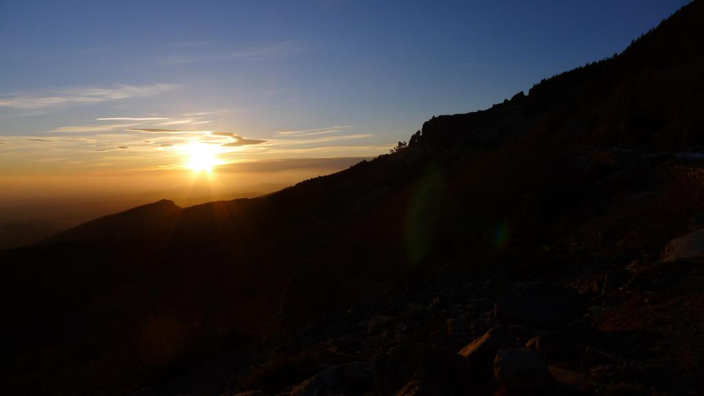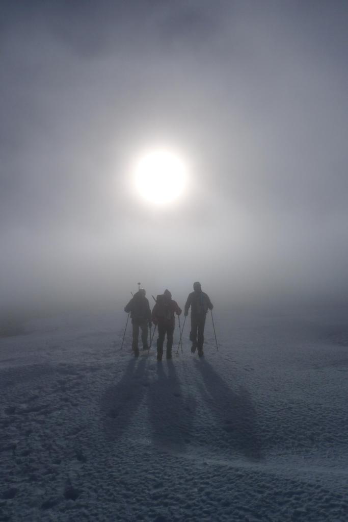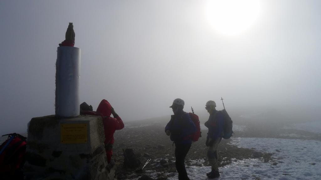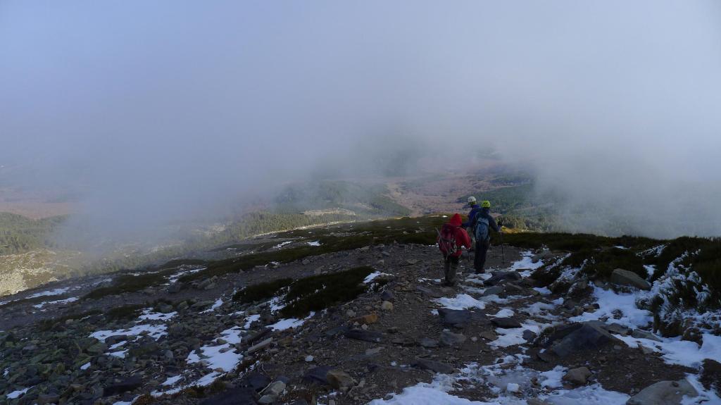 Las nubes, procedentes de la cara SW superan la cresta a toda velocidad y nos encontramos sumidos en la niebla, con fuertes vientos y un frío intenso. Apenas estamos un par de minutos en la cima. Empezamos a recorrer la cresta hacia el SE. Pasamos el cerro de San Juan (2279m) y un poco más adelante iniciamos el descenso por el camino normal, bien visible en la pedrera. Sin mayores problemas, pero con cuidado porque hay zonas heladas, llegamos al rellano donde el camino se reúne con nuestra ruta de subida. De nuevo por el bosque y protegidos del viento volvemos al Santuario y al aparcamiento (1570m 4h20′)