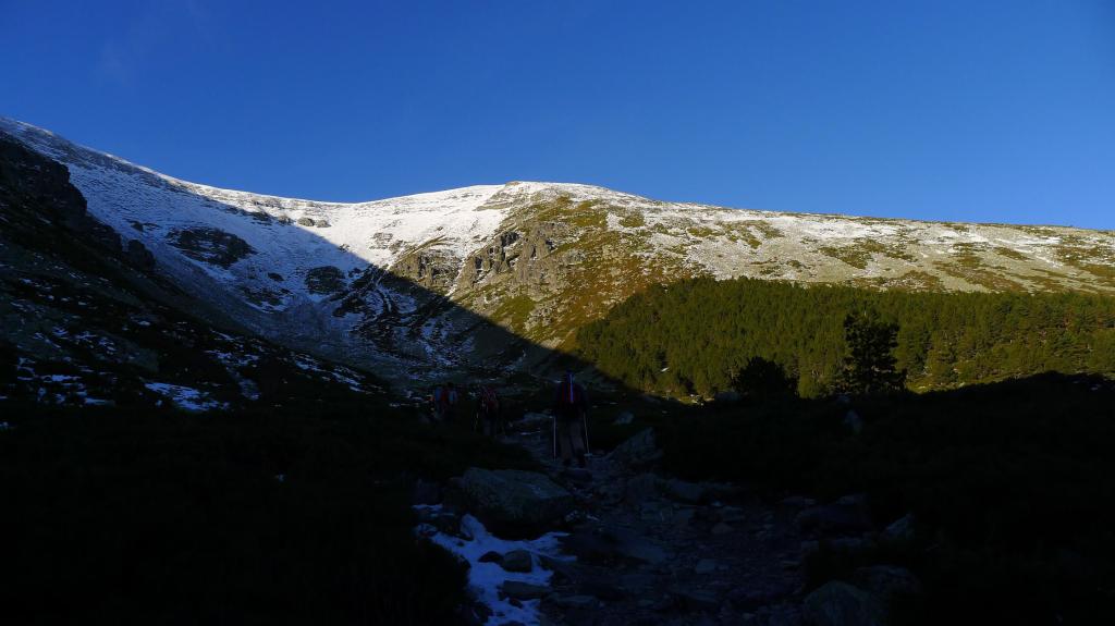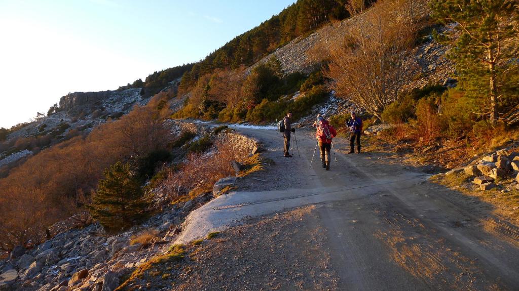 Accedemos en coche por la pista bien acondicionada hasta 1km antes del Santuario, donde hay un aparcamiento (1570m). Llegamos por la pista al Santuario y albergue (1610m 0h14′). El camino continúa introduciéndose en el bosque de pinos y gira a la derecha, haciendo zigzags con un ascenso moderado. Llegamos así hasta un rellano donde acaba el bosque (1850m) y hay unos muretes de piedra bajos .
