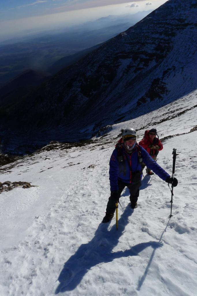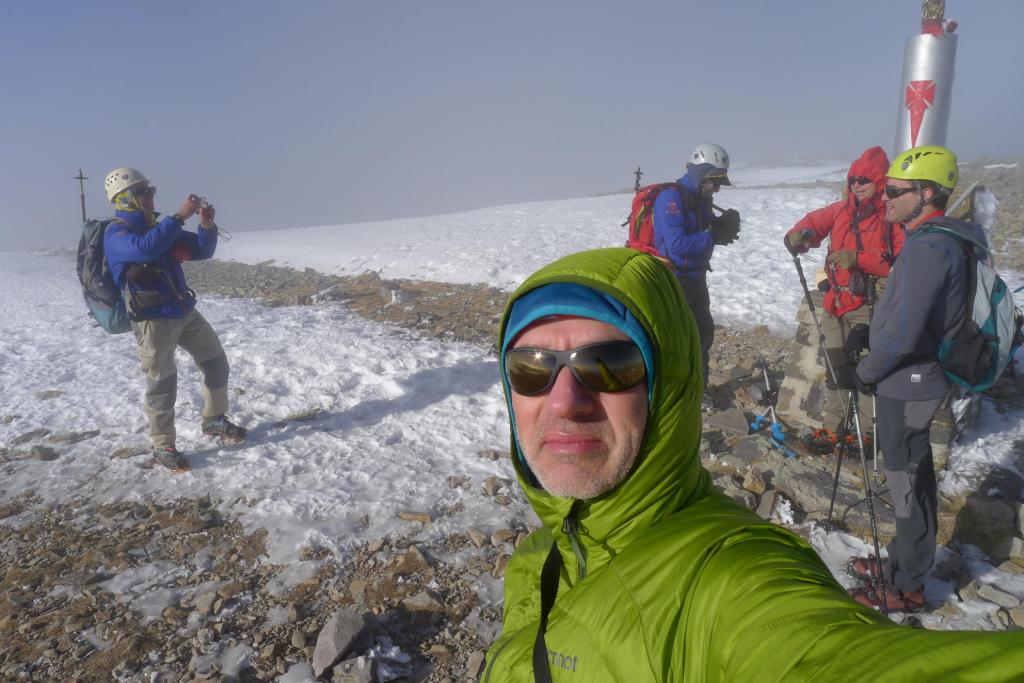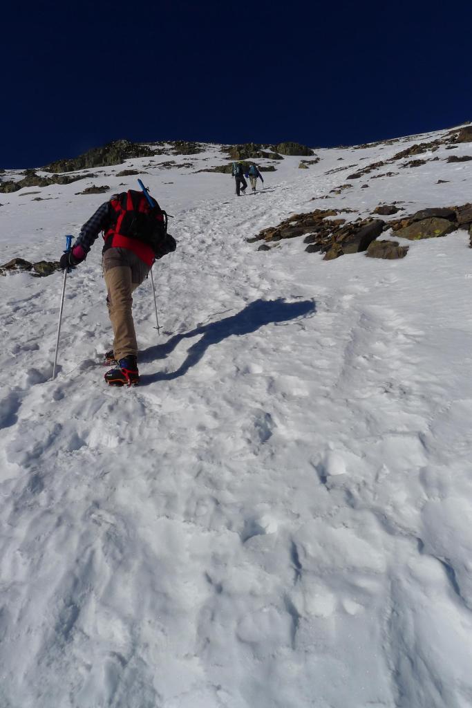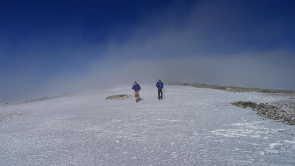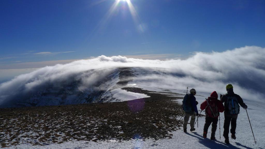 A la izquierda está la ruta normal, pero nosotros ya miramos toda la vaguada del circo del Cucharón por donde vamos a subir directos casi hasta la cima. Terreno pedregoso cubierto parcialmente de nieve dura. La pendiente se acentúa y calzamos crampones cuando afrontamos las palas más duras completamente nevadas. En el ascenso vamos girando ligeramente hacia la derecha y llegamos a la cima del Moncayo (2314m 2h10′)