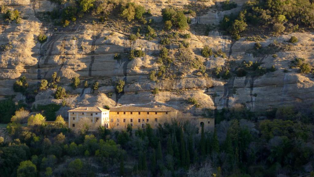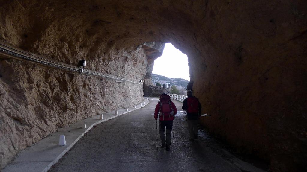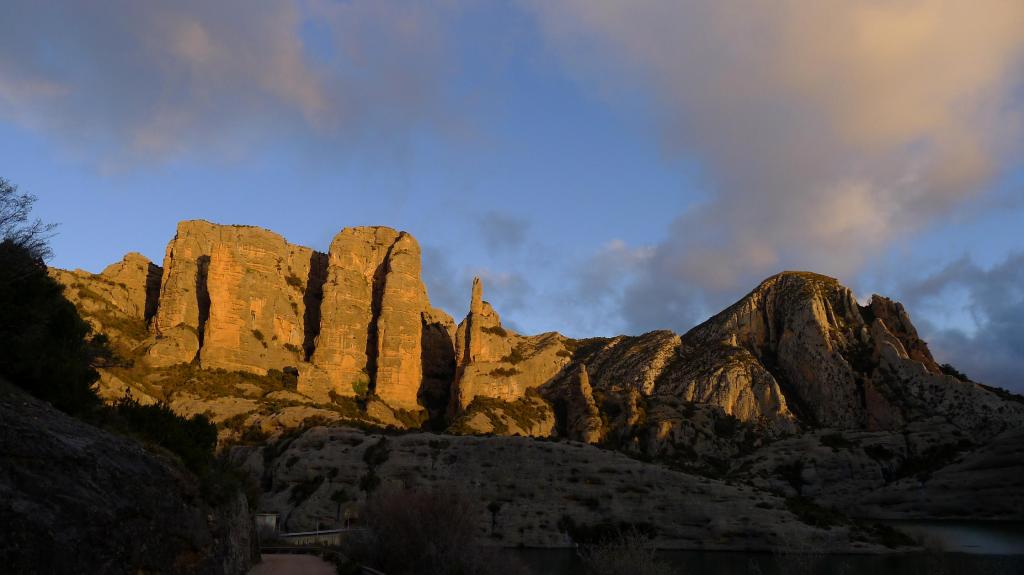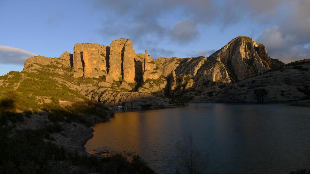Nos encaminamos por los túneles de la derecha que dan acceso a la presa sobre la cual pasamos. Las luces del amanecer empiezan a iluminar los mallos de Ligüerri. Una pista discurre por el sur del embalse y la dejamos para acceder al esconjuradero de la Santa Cruz (831m 0h39′) a nuestra izquierda, curiosa construcción a modo de templete que se utilizaba para conjurar tormentas, plagas y otros peligros.