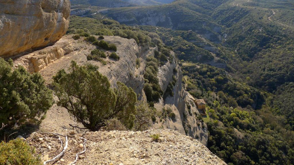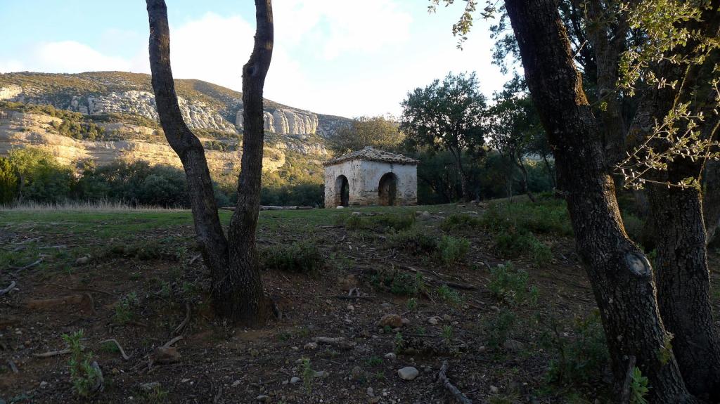 Una senda desciende hasta cruzar un arroyo (775m 0h53′) y luego sube hasta la ermita de San Cosme y San Damián (809m 1h00′), en un enclave imponente bajo la Peña de San Cosme. Desde allí vuelve a continuar la pista recorriendo una serie de ermitas. Nos desvíamos a la izquierda (cartel 911m 1h29′) por una senda que llanea entre un bosquete de encinas y bojes.
