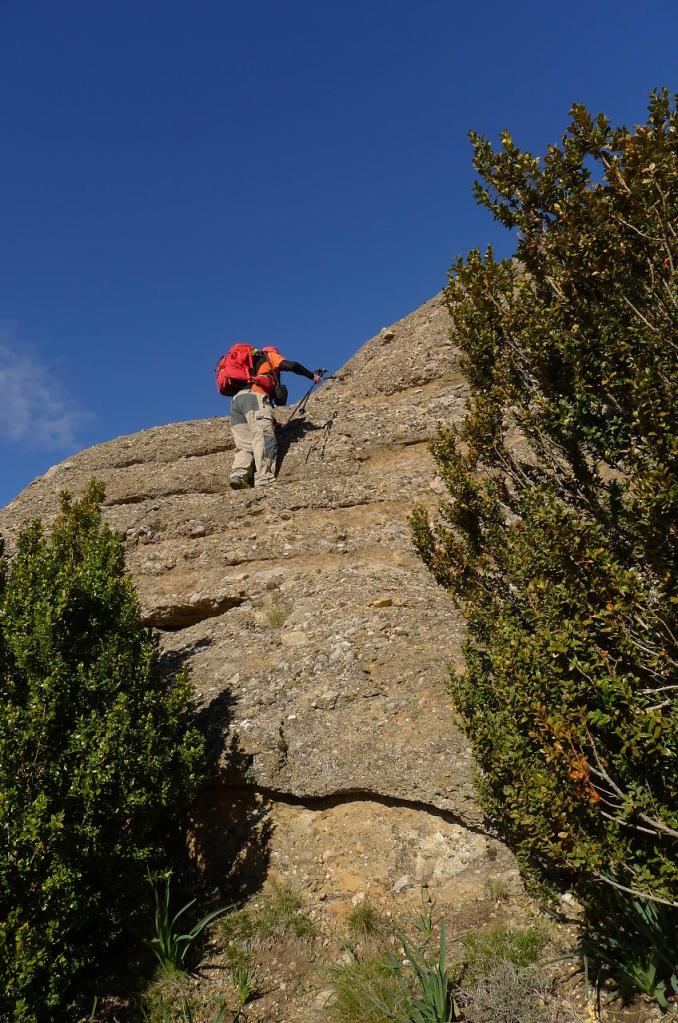 Una bifurcación (964m 1h43′) indica a la izquierda San Cosme y a la derecha Huevo. Seguimos hacia San Cosme. La senda sale al hombro oriental de la Peña iniciando la ruta rocosa. A nuestra izquierda una caída vertical no apta para quien tenga vértigo. La ruta avanza sobre estrechas terrazas en la roca, cuya superficie es muy segura. Al llegar a la zona más expuesta hay una vieja cuerda en la pared hasta el paso de la Nartesa (984m 2h04′), que superamos con mucho cuidado pero sin gran dificultad. Continúan las fajas rocosas, atraviesan algún embudo con vegetación y, finalmente, se trepa directamente hacia la cumbre. Todo el camino está jalonado de hitos, pero hay que fijarse bien de no perder ninguno.