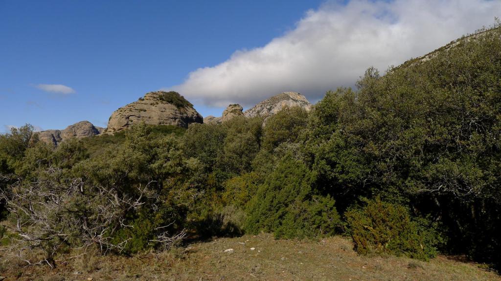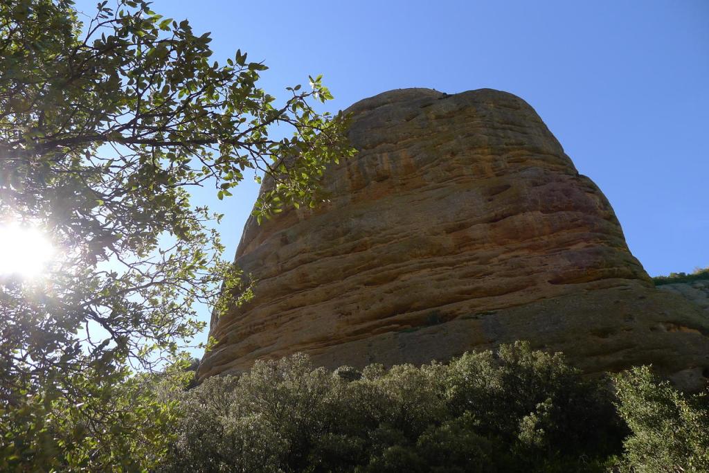 Llegamos a la Peña San Cosme (1052m 2h21′). Volvemos por el mismo camino hasta la bifurcación San Cosme-Huevo (964m 3h14′) y seguimos por el bosquecillo, que en tiempos fue utilizado para obtener carbón vegetal, hasta el final de la senda en la base de la Peña del Huevo ((896m 3h26′), pared vertical justo sobre nosotros.