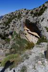 Hay carteles y volvemos a pistas. Enseguida una bifurcación a la derecha (1290m 4h31′) nos lleva a descender por un camino muy pedregoso, conectando con otra pista (1100m 4h49′) que seguimos hacia la izquierda y está señalizada como PR-HU-110, y nos lleva, descendiendo unas escaleras en la roca, a la ermita de Nuestra Señora de la Peña (1147m 5h15′). Visitamos la ermita y la casa de los ermitaños. La localización es impresionante.