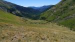 Una tenue senda faldea por pastos y helechos hasta llegar bajo el refugio de las Fajas (1693m 1h09′). La senda sigue por pastos junto al barranco del Cebollar (orilla izquierda) hacia el NW. Al llegar al circo se gira a la derecha para subir junto a la orilla izquierda de un barranco con fuerte pendiente. Cruzo el barranco (2080m 2h02′) y giro a la izquierda (otra vez NW) por un barranco subsidiario. Asciendo por la ladera de mi derecha entre hierba y pedreras, siguiendo algún hito, pero un poco confuso, hasta un paso entre dos grandes rocas (2342m 2h40′). Me encuentro bajo la pared sur de la cresta entre Tendeñera y Otal.