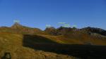 Desciendo las mismas gradas de hierba y rodeo el lac Paradis por el N y el lac Casterau por el oeste para retomar el GR (1955m 2h22′) y dejarlo enseguida subiendo una ladera herbosa directamente al lomo occidental del pic Casterau (2080m 2h37′). Una senda con hitos zigzaguea claramente por esta fuerte pendiente, justo a la izquierda de la cresta oeste, que lleva a la meseta cimera del pic Casterau (2227m 2h55′), centro estratégico desde el que domino todo el territorio de la excursión de hoy y también el valle de Bious bajo la niebla. Asomarse a la pared S resulta vertiginoso.