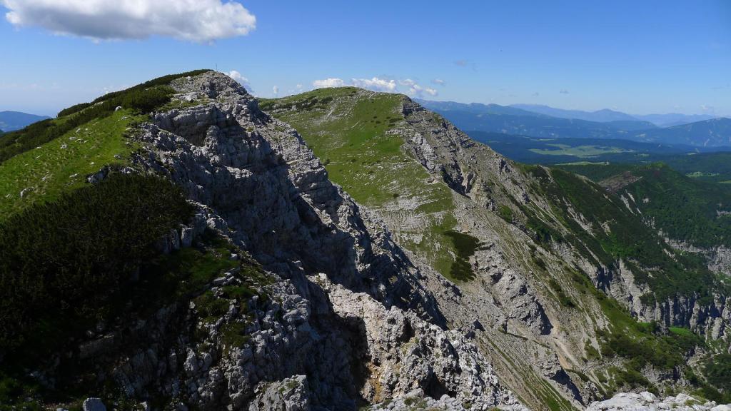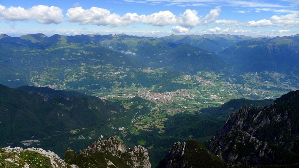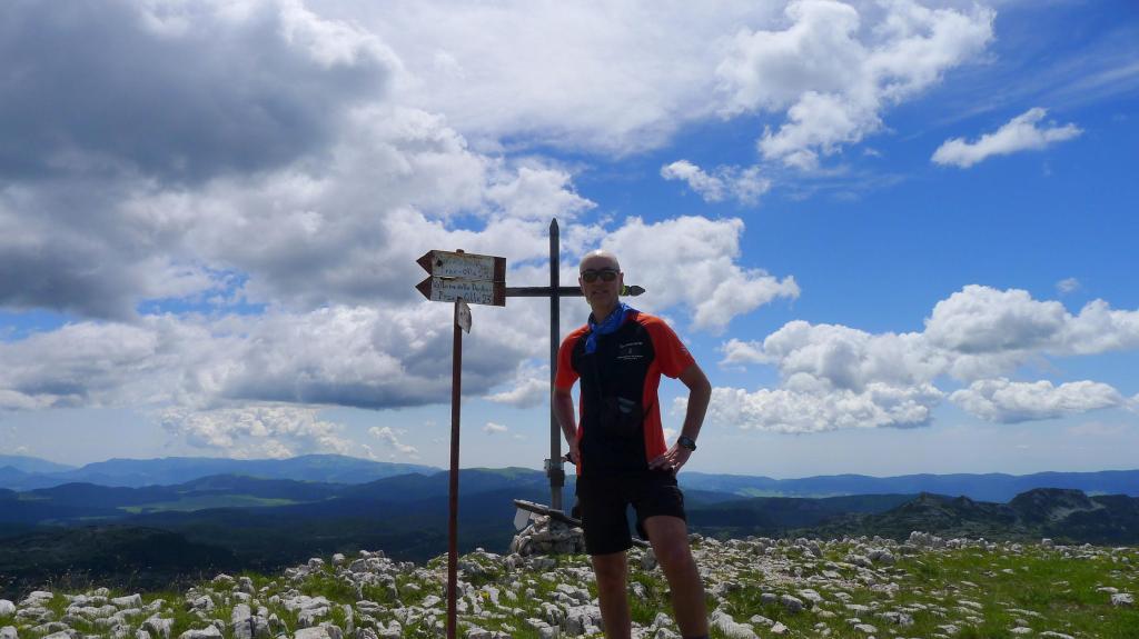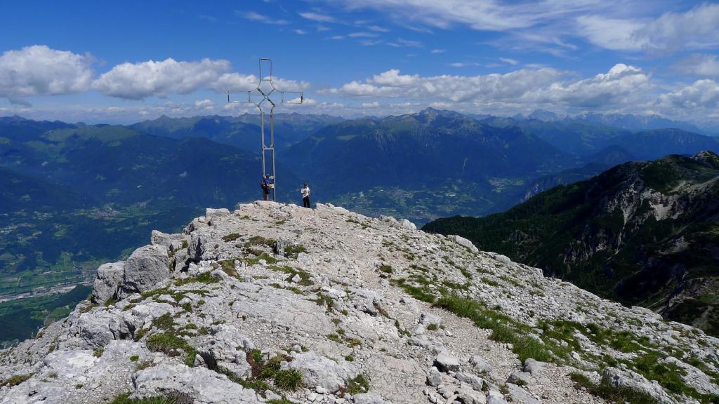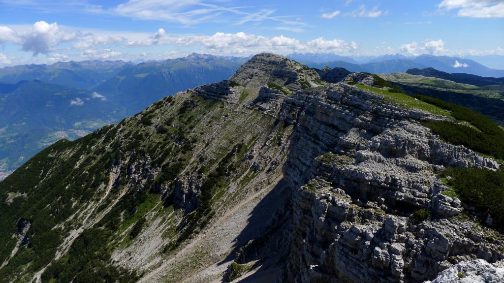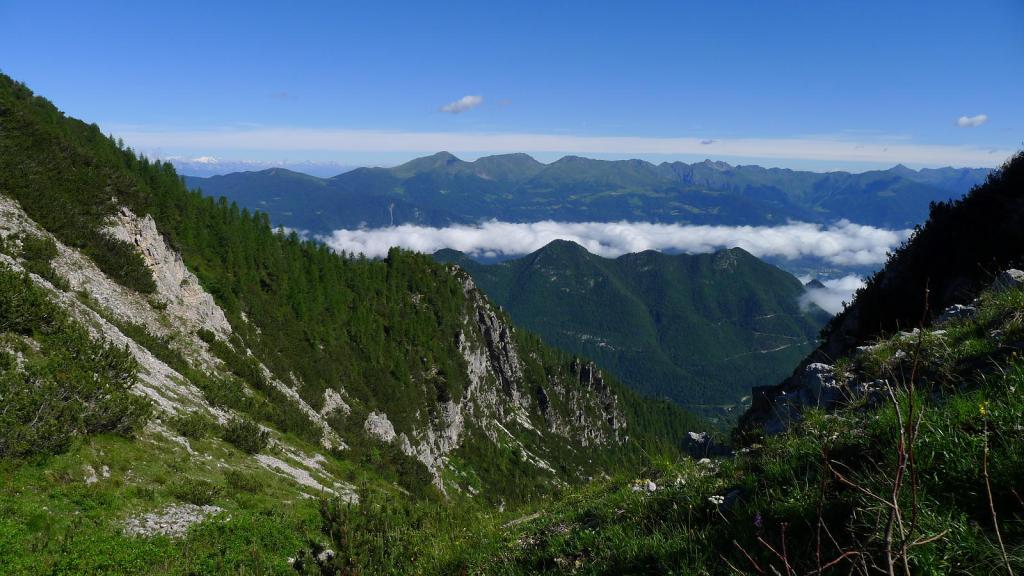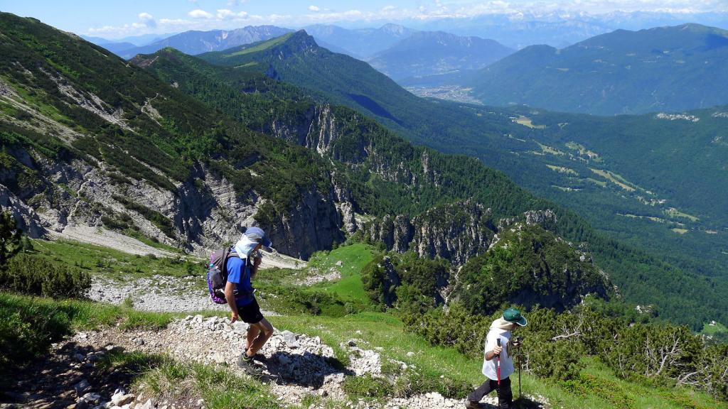 Desde el Trentin la ruta continúa más incómoda fuera de sendero. Además no se puede seguir la cresta porque hay pequeños bosquetes de pinos bajitos que hay que esquivar. Al final, por una ladera herbosa, llegamos al collado en la base del Dodici caracterizado por tener una gran dolina (2188m 2h37′). La cresta directa nos parece un poco fuerte, así que tomamos una senda que bordea por la derecha y luego gira a la izquierda para afrontar las últimas pendientes hasta la cima Dodidci (2336m 2h59′). Hoy sí tenemos vistas, aunque con algo de calima; Vemos las cimas que hicimos ayer y antes de ayer, glaciares alpinos más lejos y bajo nosotros la imponente caída hasta el valle del Brenta.