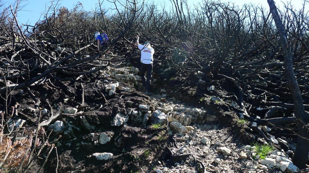 Andamos por la pista Valrenzola hasta que sale un sendero a la izquierda (1800m 0h31′) que asciende fuertemente. Más arriba el bosque es de pinos y está quemado por algún incendio reciente. Llegamos al collado Porta Renzola (1949m 0h48′) y seguimos a la derecha (E).