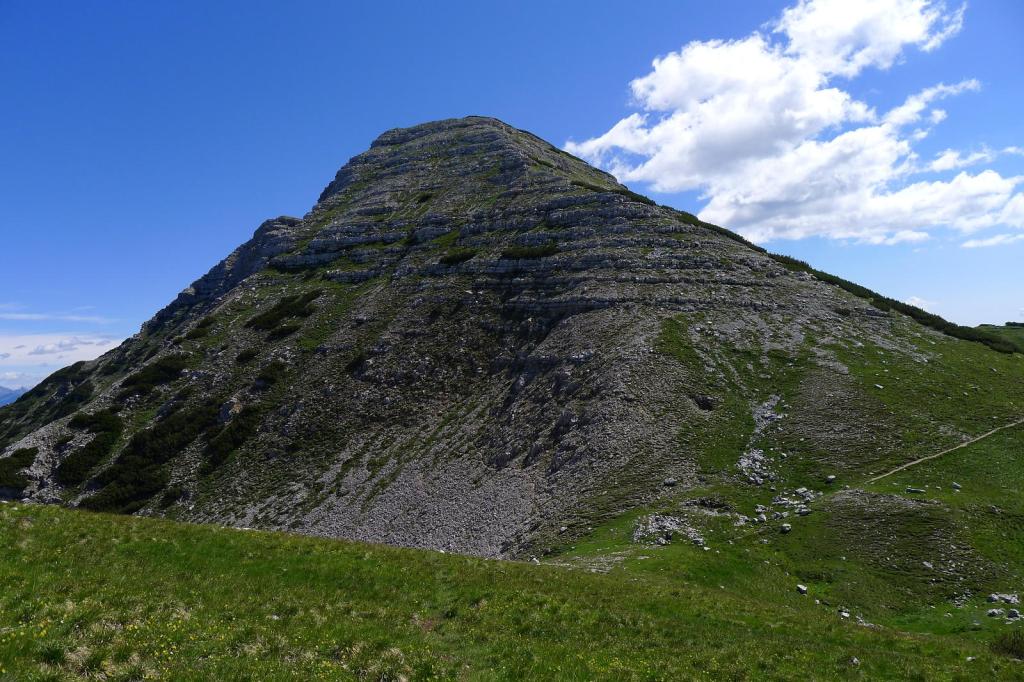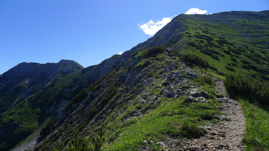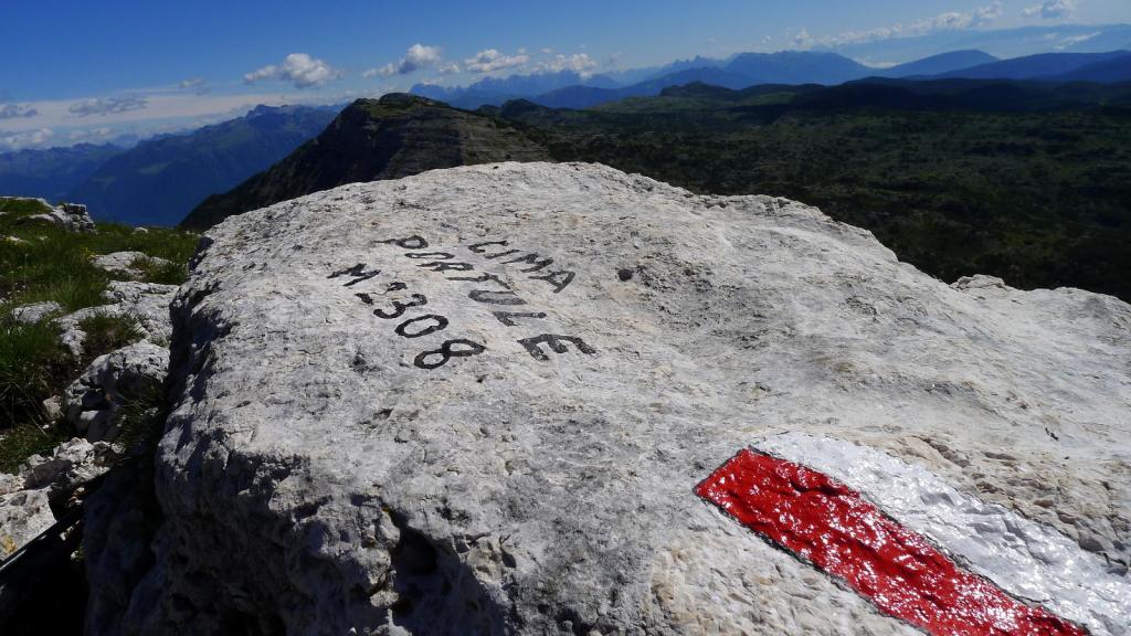 La senda se bifurca (2030m 0h59′), a la derecha sigue más o menos la cresta para dirigirse hacia la cima Portule, mientras que el ramal de la izquierda será por donde volveremos, faldeando la cara norte de la cresta. Ascendiendo a una cota marcada como Monte Kempel (2295m 1h25′) y, dirigiéndonos a la derecha, por un espolón sur, llegamos a la 1ª cumbre, la cima Portule (2308m 1h29′).