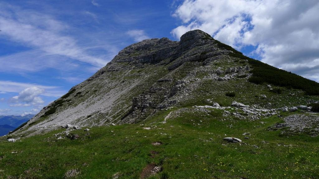 Volvemos a monte Kempel y descendemos hacia la derecha (NE) por sendero difuso hasta un collado, la Porta Kempel (2144m 1h51′), donde tomamos el potente lomo rocoso que asciende primero hasta una cruz con flecos (2294m 2h08′) y luego, más suavemente, a la cima Trentin (2325m 2h17′). El Dodici aún se ve muy lejos y algunas nubes gordas se empiezan a formar, pero la amenaza no se concretará finalmente.