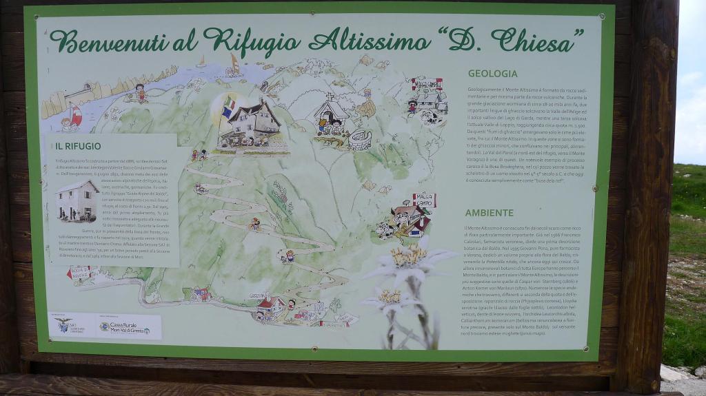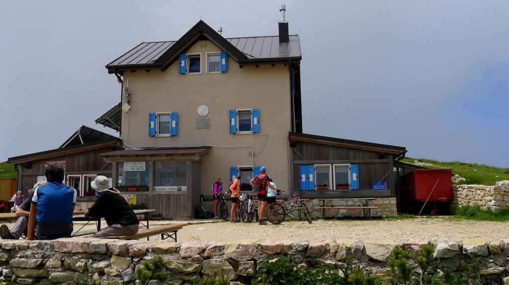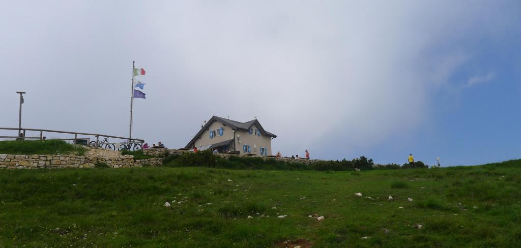 Descansamos un momento junto al coche después de bajar del Valdritta y volvemos atrás por la carretera, tomando una desviación a la izquierda que sube al refugio Graziani (1630m). Esta es una zona con más afluencia de gente. Hay una pista que asciende al Altissimo di Nago, algunos lo hacen en bicicleta, nosotros andando, pero atajamos por una senda ligeramente marcada entre el pasto de la ladera de la montaña, hasta el refugio Griggoli (2050m 0h46′), donde hay bastante gente. Por detrás del refugio, muy cerca, se alza la suave cota del Altissimo di Nago (2079m 0h49′). Descendemos por la misma ruta al refugio Grazziani (1630m 1h44′).