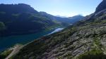 Desayunamos algo en la habitación y salimos a las 7:15 para poder tomar el primer teleférico de la Marmolada que sale a las 8:00. En el siguiente pueblo al este de Campitello, Canazei, tomamos la carretera que va al lago Fedaia, donde llegamos en 0h30′. Se pasa sobre la presa y se aparca unos metros más arriba junto al mismo teleférico (2074m), ya que a esta hora el aparcamiento está prácticamente vacio.