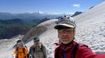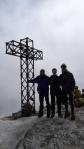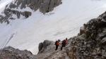 Volvemos a calzar los crampones y superamos la arista hasta la cruz final de Punta Penia (3342m 2h06′). Hay también un refugio junto a la cima. Nos sorprende la poca gente que hay comparando por ejemplo con el Aneto u otros picos famosos de los Pirineos. Empiezan a formarse cúmulos de nubes, pero tenemos buena temperatura y un panorama espectacular. Comemos algo, con las chovas piquigualdas a la expectativa de los restos y afrontamos el descenso.