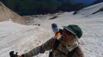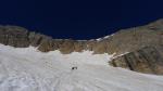 El glaciar está dividido en dos zonas por un lomo rocoso. La parte más amplia queda a la izquierda y el ramal más estrecho de la derecha es el que hay que subir. Hacemos una travesía hacia la derecha y luego la huella asciende bastante directa hacia arriba. Esta primera parte es una subida lenta y constante por glaciar. Encordarse no parece necesario, las grietas están bastante altas por encima de nosotros y la huella muy marcada.