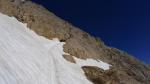 Desembarcamos en Pian de Fiacconi (2626m), junto al refugio. Por unas escaleras picadas en la roca se sube al refugio Capanna al Ghiacciaio (2700m 0h08′). Desde aquí ya empieza a haber nieve y enseguida calzamos los crampones. Visualizamos la ruta por la huella marcada en el glaciar, que todavía está bastante cubierto de nieve y a veces te hundes un poco; unas polainas nos habrían venido bien.