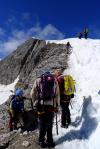 Pasados los 3000m se llega a la pared rocosa de la derecha (Chimenea 3120m 0h24′). Nos quitamos los crampones y seguimos la sirga que asciende por una chimenea oblicua hacia la derecha. Lo más recomendable sería asegurarse a la sirga con material de ferrata, pero realmente no es difícil, no pasa de IIº, y con la ayuda de la sirga superamos estos metros de trepada sin mayores problemas, hasta salir de la diagonal a la cresta final (3190m 1h40′). Los puntos inicial y final de la chimenea podrían ser problemáticos si hubiera mucha gente, pero por suerte ésto está muy tranquilo.