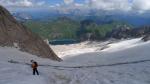 Muy cuidadosos en la chimenea de roca, pero sin problemas, entramos de nuevo en el glaciar y descendemos pausadamente. Al salir del glaciar seguimos una ruta con hitos que deja el refugio Capanna al Ghiacciaio a nuestra derecha y llegamos algo más directos al teleférico en Pian de Fiacconi (2626m 3h51′). Ahora hay un montón de gente por los alrededores y también hay gente subiendo por la ruta que salva el teleférico.