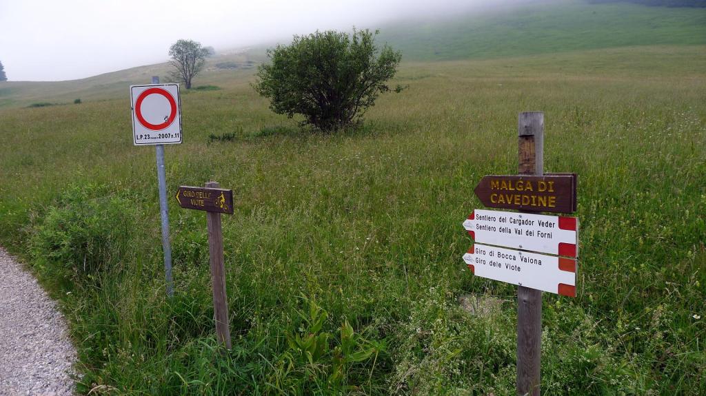 Volvemos al mismo macizo de ayer pero más al norte, cerca de Trento. Tenemos que descender de nuevo al fondo del valle del río Adigio, que está a unos 180m de altura, desde Serrada que está a 1200m y volver a subir por la otra vertiente hasta 1500m. El punto de inicio está muy cerca de un bar-restaurante llamado Malga Viota; es una zona de amplios pastos y aparcamos en un pequeño ensanchamiento casi enfrente del cartel indicador hacia Malga di Cavedine (Sendero del Cargador Verder y della Val dei Forni 1555m). Toda esta zona se llama Monte Bondone y ascendemos el pico más alto, el Cornetto di Bondone.