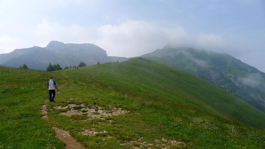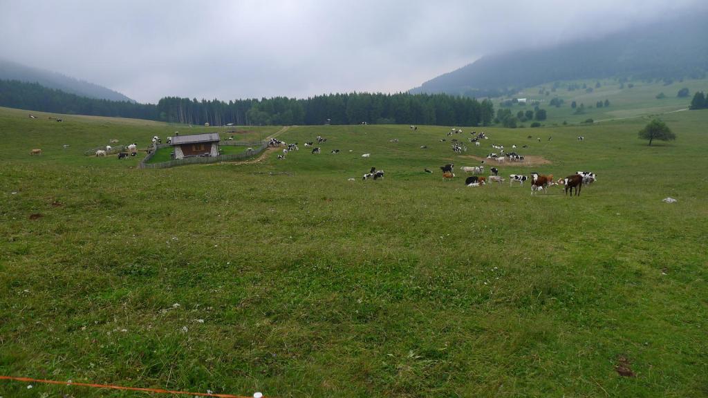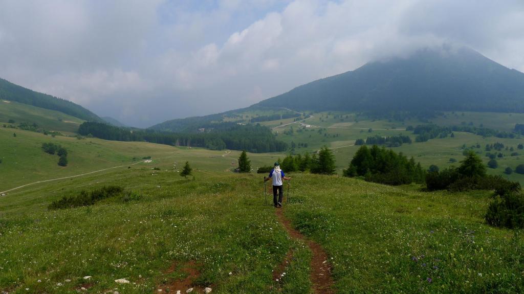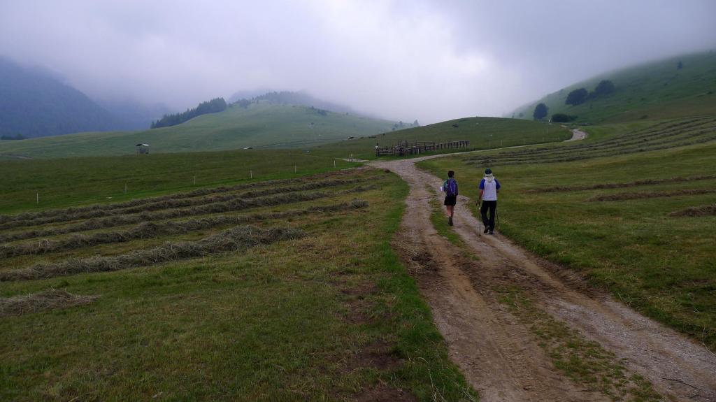 Avanzamos por una pista que atraviesa un bosque de pinos y salimos a pastos, atravesando una finca con vacas entrando y saliendo por vallas electrificadas; en medio está la casa Malga Fragari (1570m 0h15′). Sube el camino bien acondicionado, con escalones en la ladera de hierba; luego el ancho y cómodo camino se introduce por bosquecillo de pinos bajos con pendiente moderada. Después por un amplio lomo herboso con una gran pendiente a nuestra izquierda.