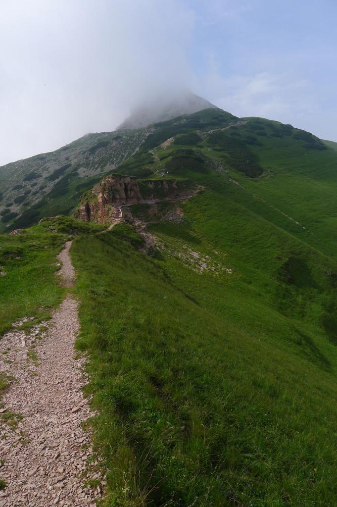 El camino a la cima Verde (2090m 1h14′) se va a la izquierda y nos metemos en una senda pedregosa de fuerte pendiente que rodea el Cornetto por la derecha (oeste). Estamos metidos en una densa niebla, hay alguna bifurcación del sendero, pero parece más o menos clara la dirección ascendente oeste y sur para llegar a la punta rocosa del Cornetto (2178m 1h21′).