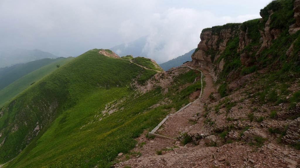 Pasamos el cruce que va a Vezzano (1791m 0h40′) a la derecha y continuamos recto por el lomo, siempre hacia el sur. Se llega a una zona más plana, casi como un collado (2000m 1h04′) y el camino se vuelve a acondicionar para pasar junto a una zona rocosa de color rojizo que queda a nuestra izquierda; entonces se llega a un área herbosa en la base del Cornetto.