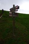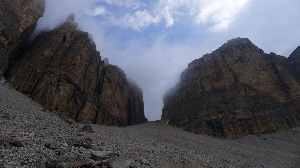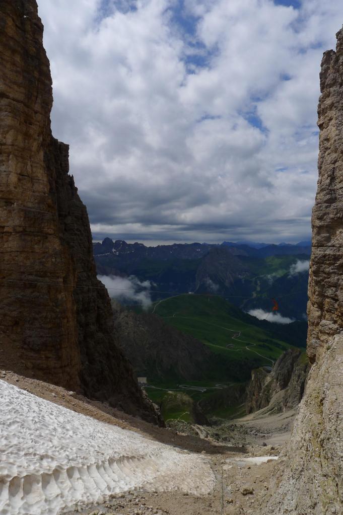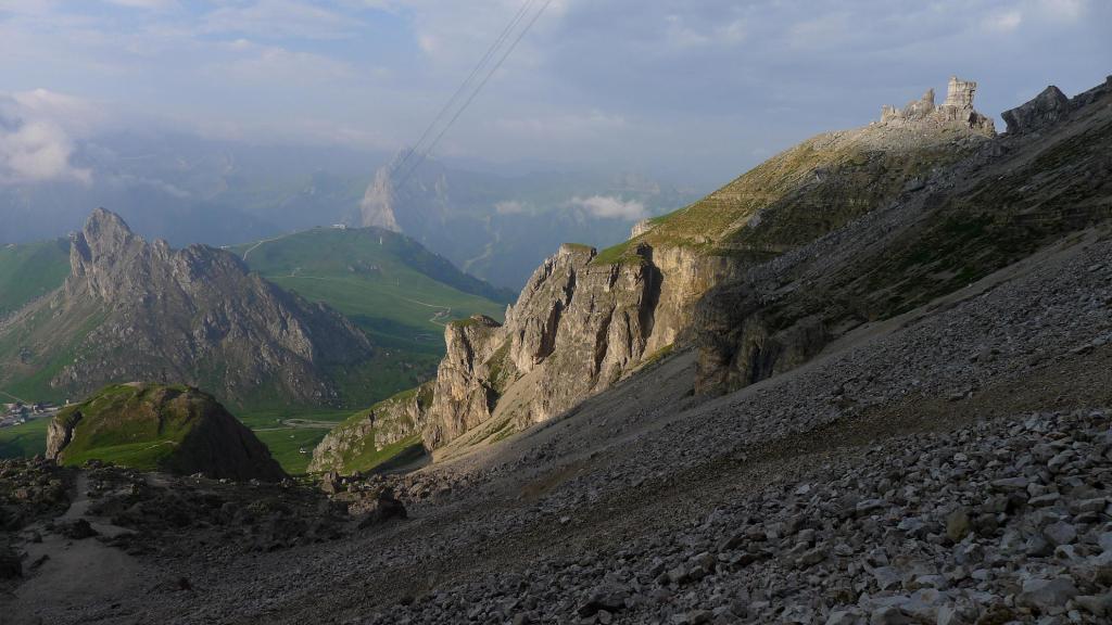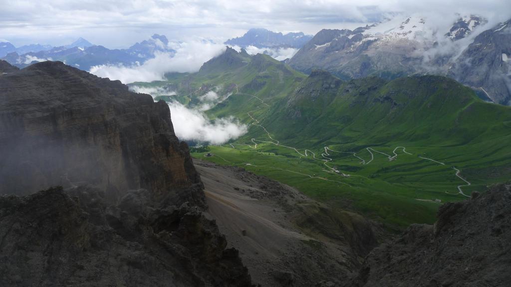 Desde el Passo Pordoi (2240m) asciende un senda al norte entre los prados, al principio con escalones de tablas de madera que resbalan con la humedad. Los lomos herbosos enfilan la gran pedrera que termina en una enorme brecha que es la Forcella Pordoi. La senda de piedrilla zigzaguea para ganar rápidamente altura, y la gran pedrera, que parecía muy incómoda, realmente no lo es. Nos cae un chaparrón, pero se pasa enseguida.