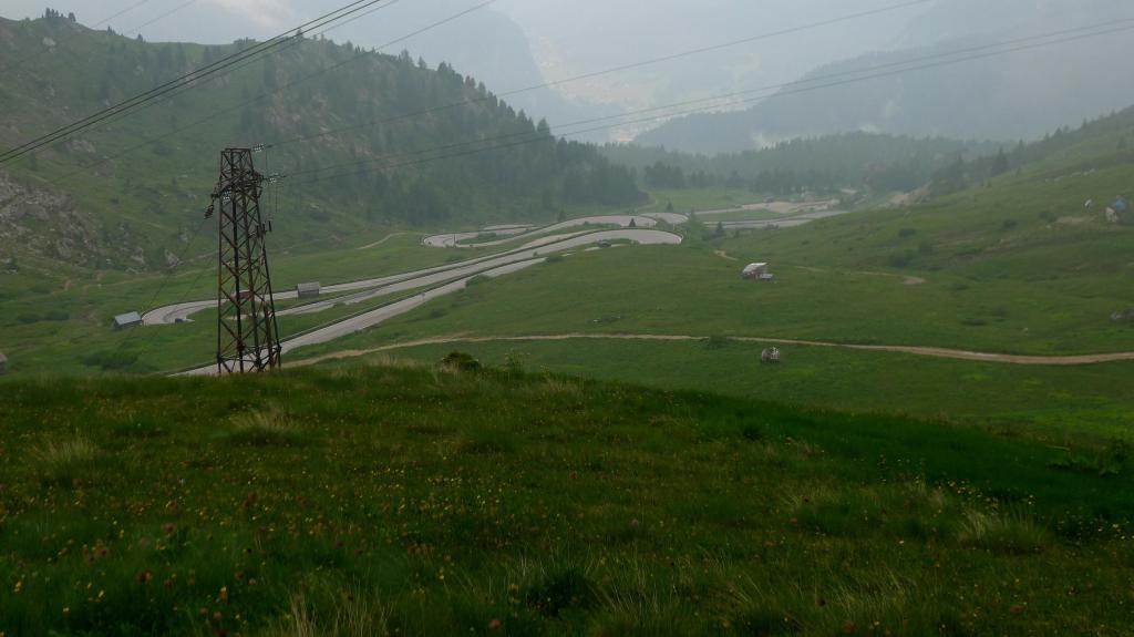 Nos levantamos a las 6h, con un día bastante nublado. Salimos hacia el este hasta Canazei y tomamos la carretera que sube al norte al Passo Pordoi. Está bastante solitario, sólo nos acompaña el monumento en recuerdo a Fausto Coppi. Descubrimos que Martín viene en chanclas y no ha cogido ningún par de calcetines, lo cual provoca un leve incidente, pero al fin encuentra unos tirados en algún rincón del coche.