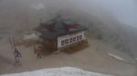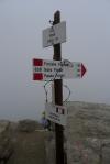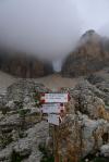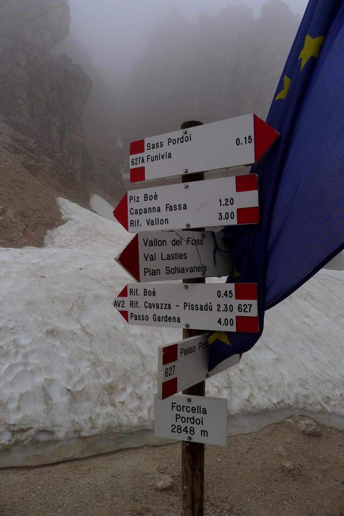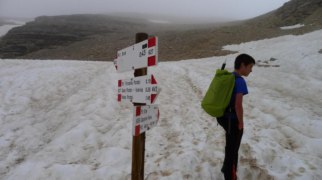 Cuando llegamos a la Forcella Pordoi (2850m 1h11′), donde se encuentra el refugio, está todo envuelto en niebla. Continuamos la senda a la derecha del refugio que se introduce por una zona rocosa bastante llana. Hay algunos neveros que pasamos sin problemas. A pesar de la falta de visibilidad la ruta está muy bien valizada, con hitos, pintura roja/blanca y postes pintados en rojo/blanco.