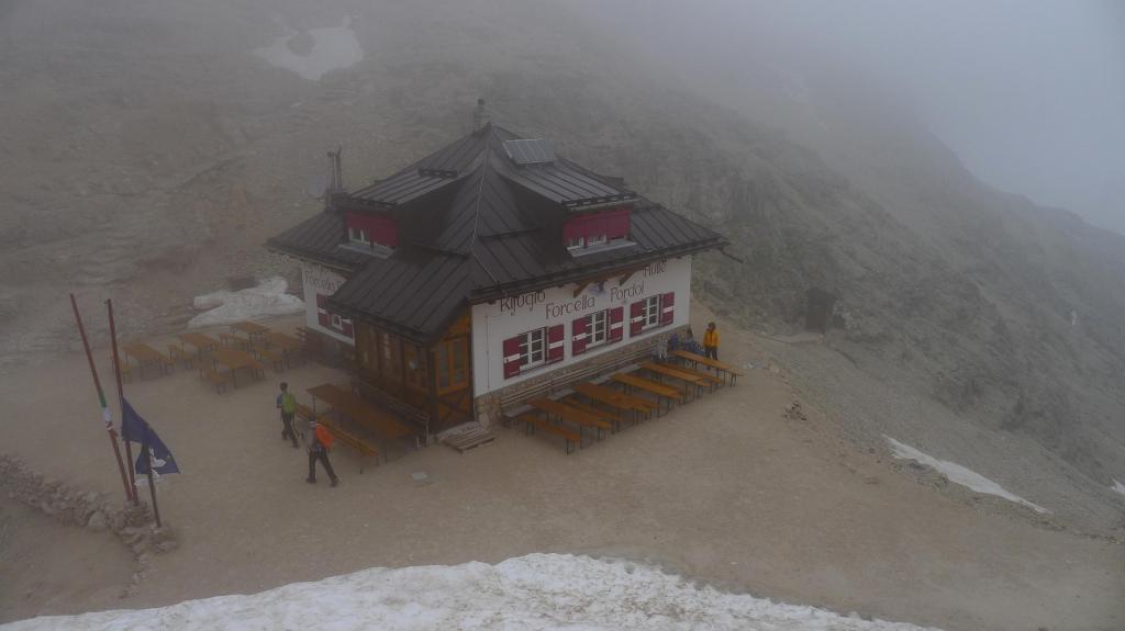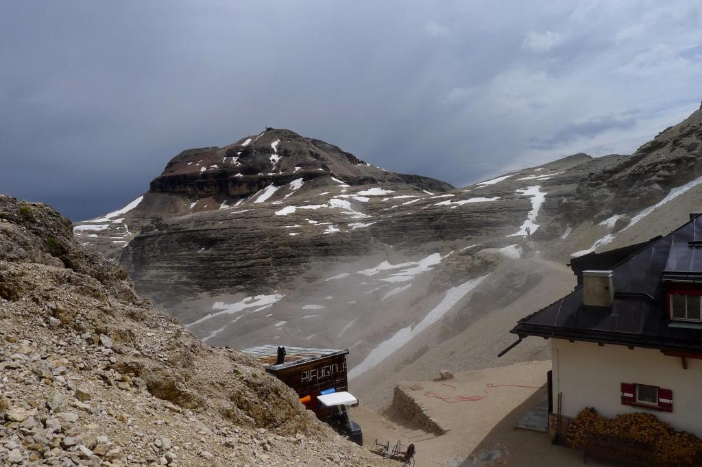 Salimos del refugio tras 42′ de descanso (2h52′). En el descenso empieza a llover fuerte y luego una tormenta con rayos que parecen caer bastante cerca, así que llegamos al refugio de la Forcella empapados y a la carrera (2850m 3h29′, 0h37 desde la cima). Aquí tenemos que esperar 1 hora y decidimos que en cuanto pare de llover subimos al Sass Pordoi para bajar en el funicular.