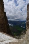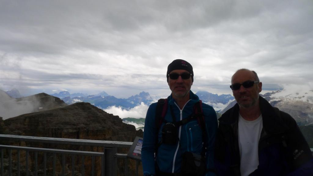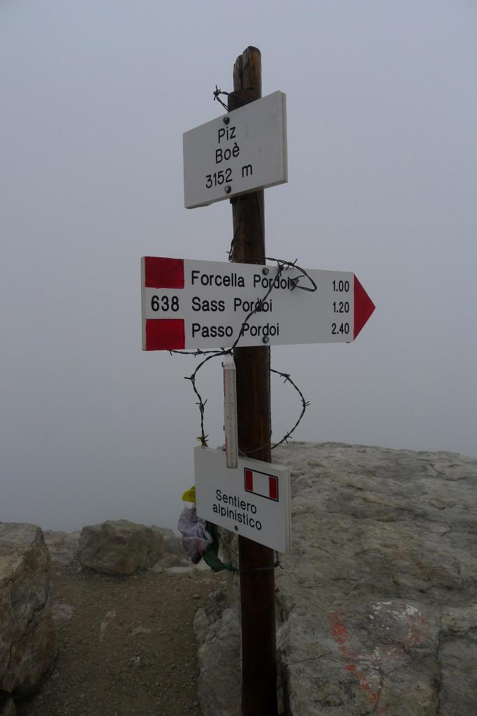Dejamos el refugio (4h31′) abarrotado y en el corto ascenso al Sass Pordoi se abre un poco el cielo y tenemos unas vistas espectaculares del Piz Boe y los cañones que lo rodean, que nos recuerda bastante al paisaje de Ordesa. Llegamos al Sass Pordoi (2950m 4h49′, 0h18′ desde Forcella Pordoi) y descendemos en el funicular para quitarnos rápidamente en el coche nuestras ropas mojadas y poner a tope la calefacción. Alas 13h ya estamos en el hotel para darnos una buena ducha caliente.