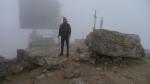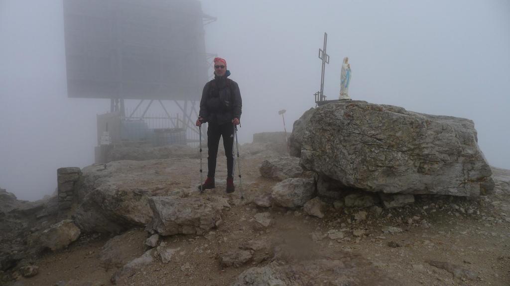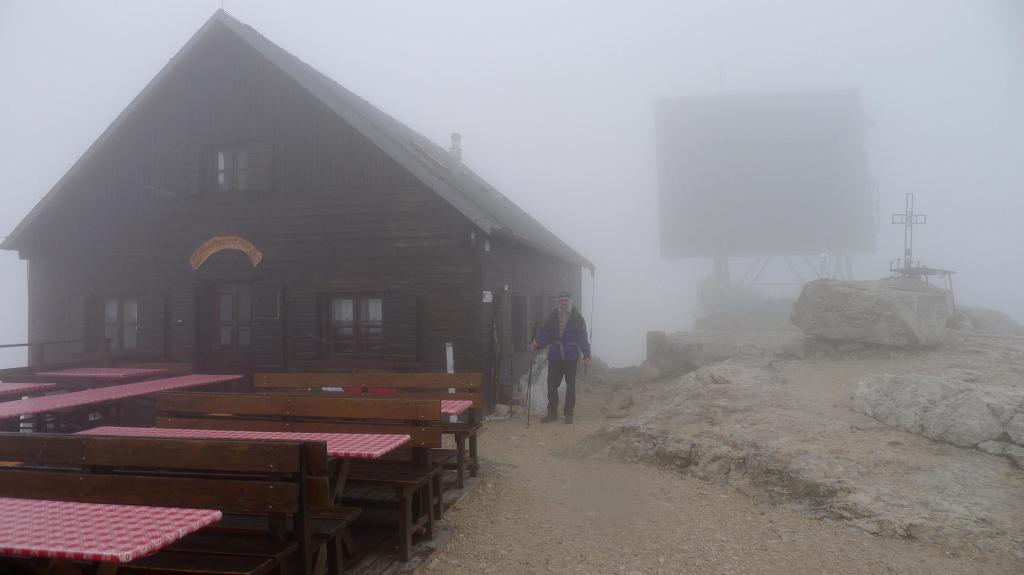 Llegamos al Piz Boe (3152m 2h10′) envueltos en niebla húmeda y con algo de viento. Justo antes de la cima hay una plataforma para helicópteros y en la misma cima el refugio Campanna Fassa, donde descansamos un rato y tomamos un té junto a la estufa.