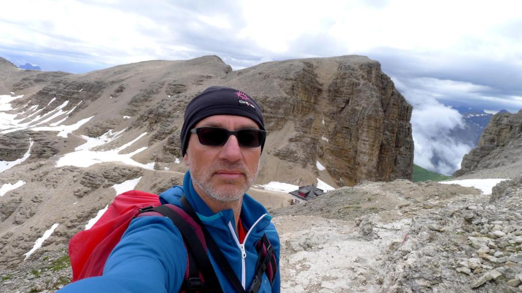 Pasamos junto a un pequeño vivac (2840m 1h26′) que queda a nuestra izquierda, donde sale la senda que va al refugio Piz Boe, al norte del pico, y seguimos hasta un pequeño collado (2890m) que ni siquiera distinguimos, pero desde el que se inicia la ascensión al lomo SW del Piz Boe.Comienza una pendiente rocosa más fuerte y hay varias zonas equipadas con sirgas (2950m 1h49′) y grapas, pero son pasos fáciles; lo único que con la humedad la roca está muy resbaladiza y hay que tomar precauciones.