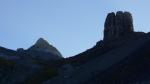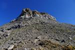 Llego a una cubeta (2250m 1h43′) que desciendo para afrontar, hacia la derecha, la pedrera bajo los Mallos. Los hitos son más frecuentes y hay traza de senda por la pedrera. El muro que está enfrente, bajo el pico Lecherín, se supera en curva por la derecha. También hay algún palo vertical como indicación. Llego al collado de Lecherín (2385m 2h00′). El perfil del Lecherín me echaría atrás si no supiera que hay un punto débil que técnicamente puedo superar.