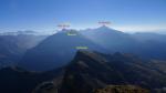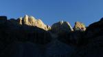 En la repisa giro a la derecha y sigo el borde de la misma rodeando la montaña hacia su cara N. Cuando se llega al cortado que forma la arista SE, asciendo en diagonal la repisa herbosa y subo por zona de piedras y hierba, delicada por la fuerte pendiente, hasta otra repisa superior donde se toma ya la arista que conduce directamente hasta el 1º pico.