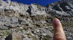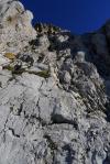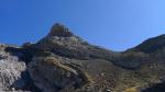Me dirijo directamente hacia el pico por traza de senda, desviándome un poco hacia la derecha (NNE). La principal resistencia la ofrece la franja de roca blanca. Hay que buscar la chimenea más a la derecha, justo antes de la pared más vertical y menos rota que forma la arista S de la montaña. Por la zona más evidente trepo los 15 o 20 m que desembocan en una repisa herbosa.