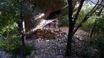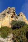 Justo antes de bajar a un barranco hay que salir de la pista y tomar una senda a la izquierda (985m 1h11′) marcada con hitos, que empieza a ascender entre monte de boj y carrasca. Llega a una gran roca aislada con un abrigo bajo ella (1030m 1h22′). Se bordea la roca por la izquierda.