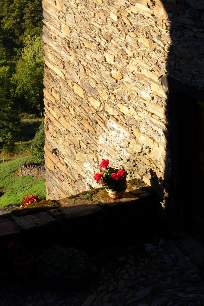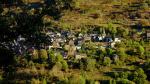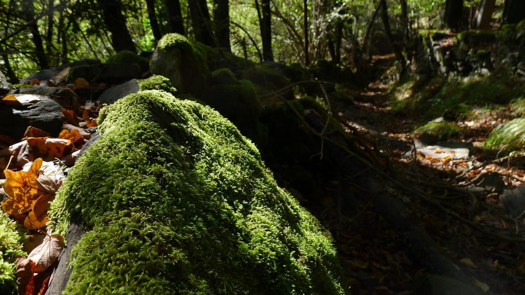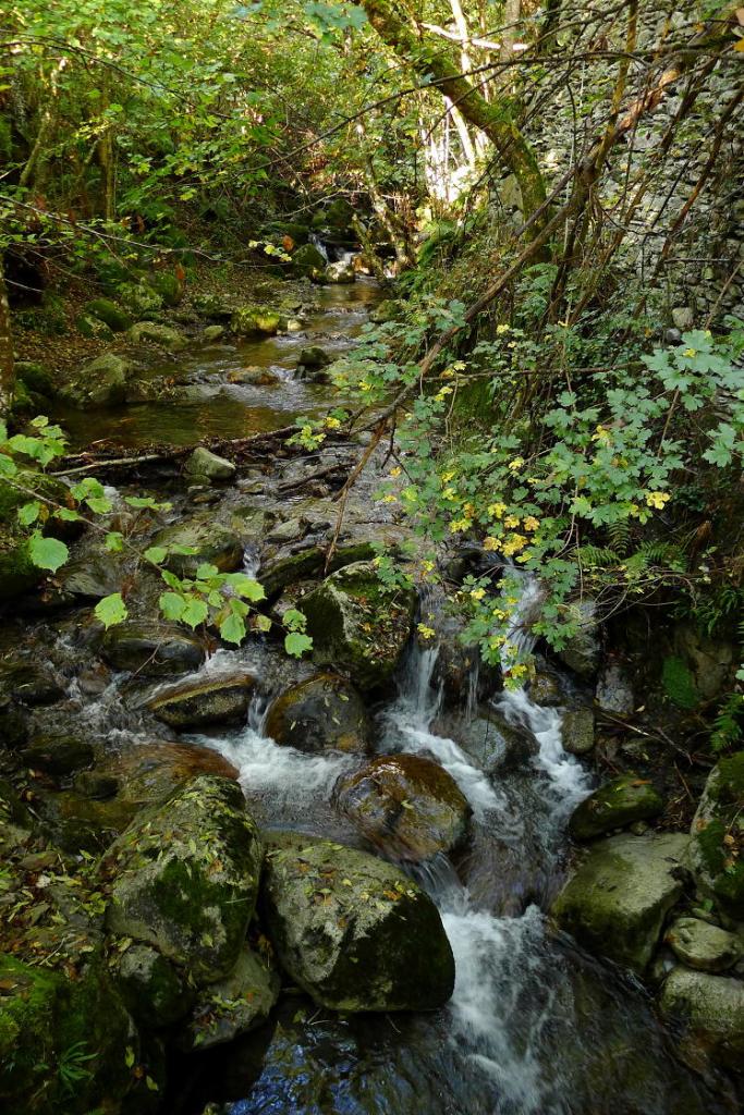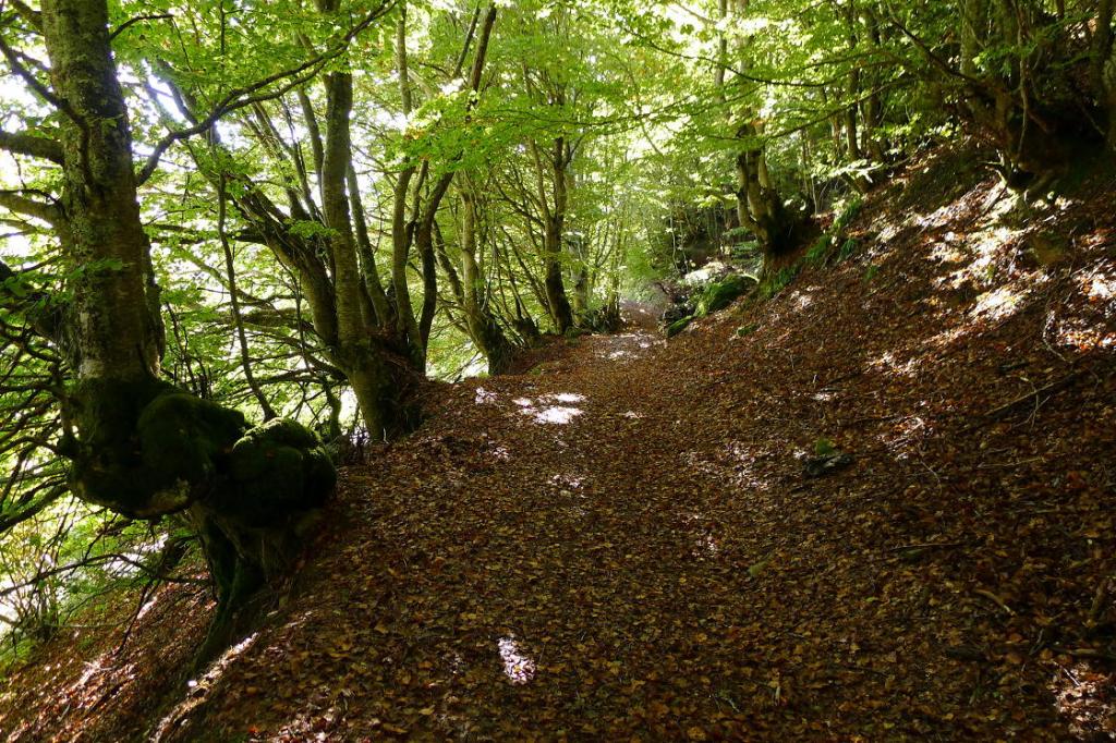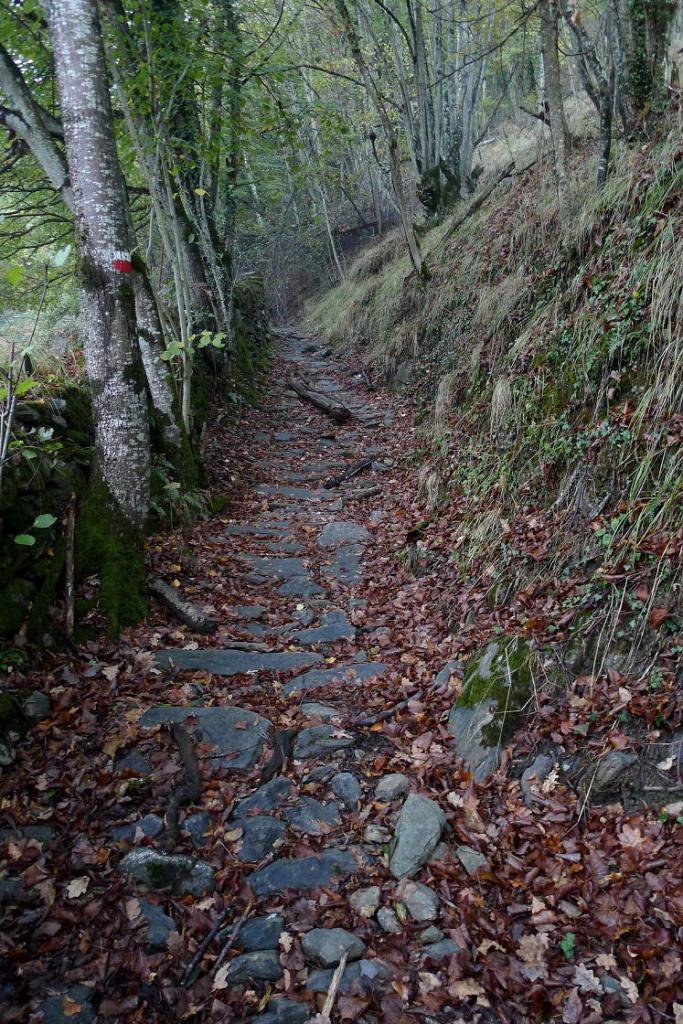 El camino empedrado y tapizado de hojas asciende con buena pendiente, entre muretes de piedra, con cuidado de los resbalones, ya que todo está húmedo de las lluvias de ayer. Al llegar a unos edificios en ruinas de antiguas bordas se gira a la izquierda y se asciende hasta encontrar una pista (840m 0h29′) que tomamos hacia la derecha.