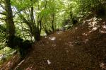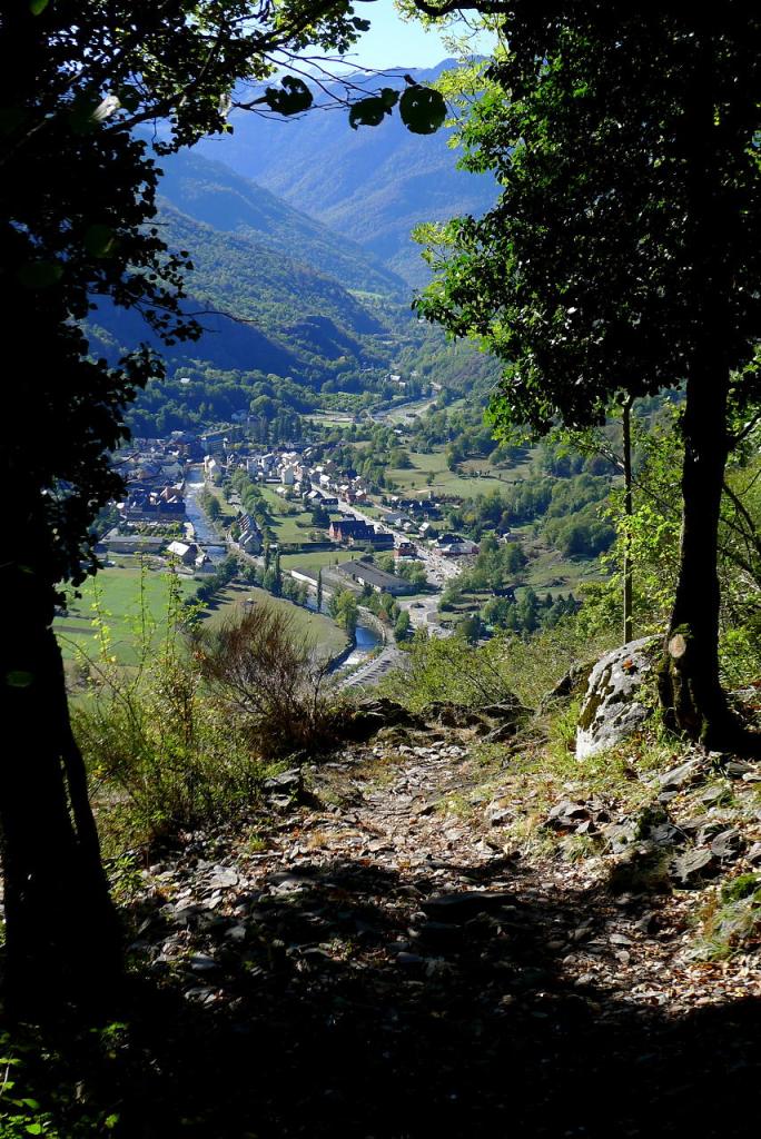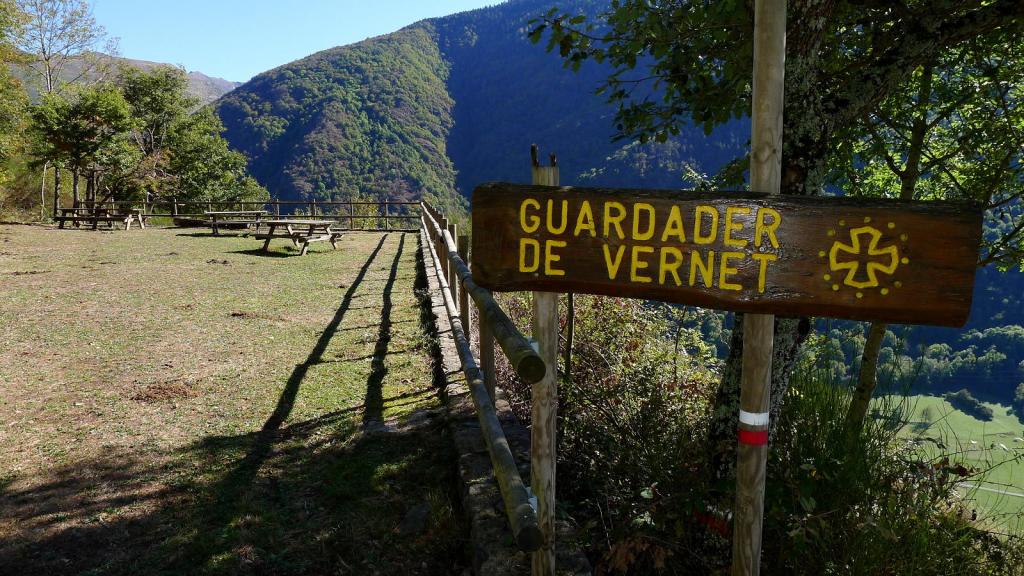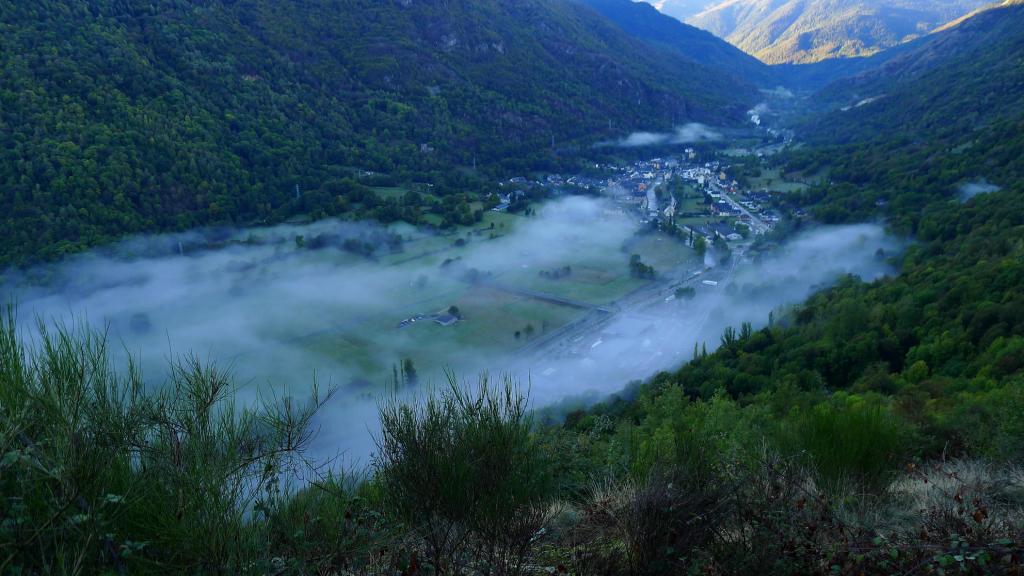 Siguiendo dirección ENE se llega a un mirador, el Guardader de Vernet (860m 0h41′) que se asoma al valle de Arán, cubierto por una fina niebla. Ahora ya por sendero nos acercamos al pueblo de Bausén (890m 1h12′). Subimos por la escalinata hacia la iglesia y giramos a la derecha tras la iglesia para salir por una pista hacia el E. Pasamos por unos campos y un buen camino se introduce en el espeso bosque de hayas, robles, arces y castaños de Carlac, que casi no deja entrar la luz.