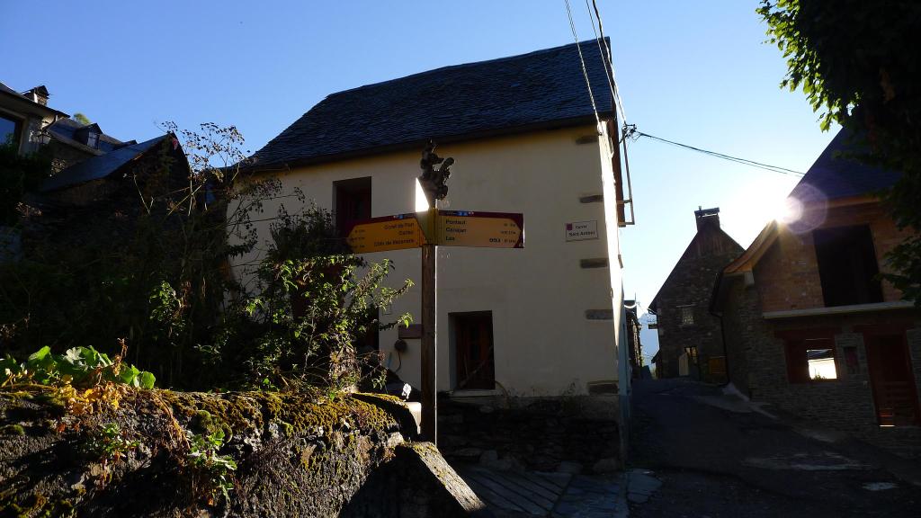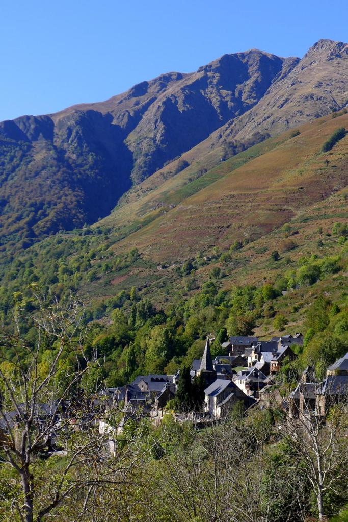 El descenso nos lleva hasta el Colhet de Pan (1175m 2h52′), donde el bosque se abre en una zona de helechos y escobas con una buena vista del macizo del Aneto, bien cubierto de nieve. Seguimos descendiendo hasta un cruce de caminos (970m 3h11′) con carteles, a la izquierda volvemos a Bausén (920m 3h16′) y retomamos el camino de subida hacia Les (625m 4h40′).