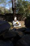 En coche volvemos a subir a Bausén por la carretera para comer en la Taverna l’Encant de Carlac . Después de la comida visitamos el curioso cementerio civil, saliendo por el mismo camino por el que habíamos iniciado la subida, pero que no habíamos visto porque está oculto a la vista y sin señalizar, pero es muy fácil de encontrar, está justo detrás de unas grandes antenas, en una pequeña hondonada entre los árboles. Un cementerio con una sola tumba de una joven cuya relación con su amado no fue bendecida con una boda cristiana; la iglesia lo prohibió ya que tenían un lejano parentesco. Cuando murió a los 33 años el cura no permitió su enterramiento en el cementerio católico y el pueblo construyó este entrañable cementerio civil para ella.