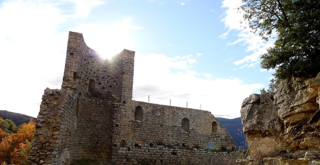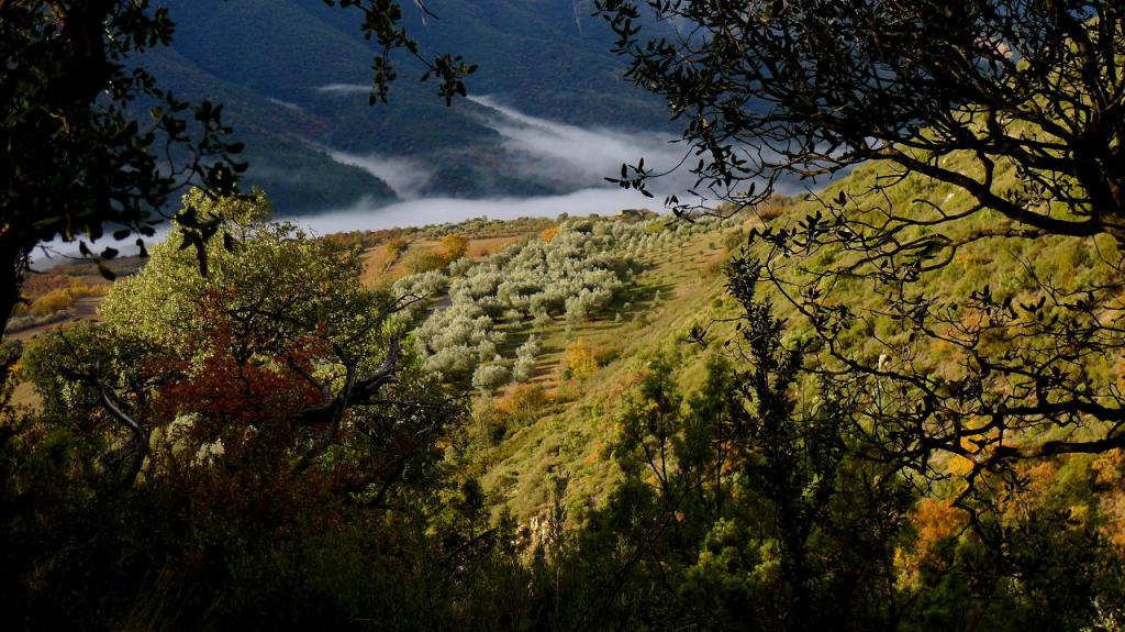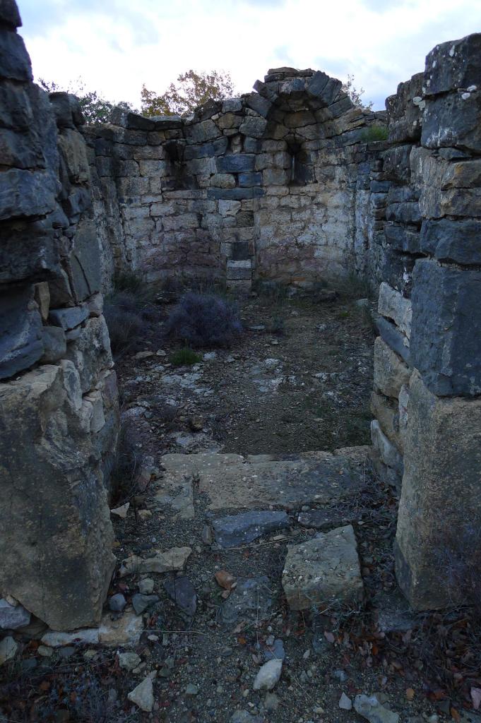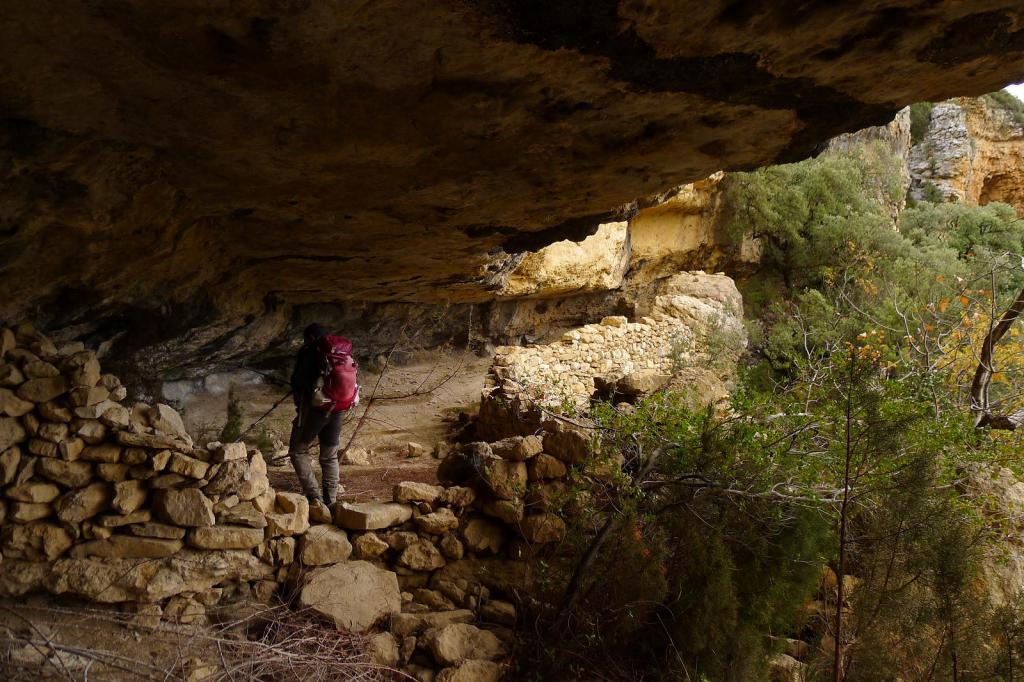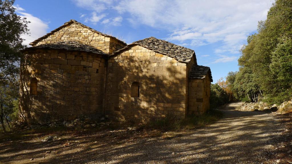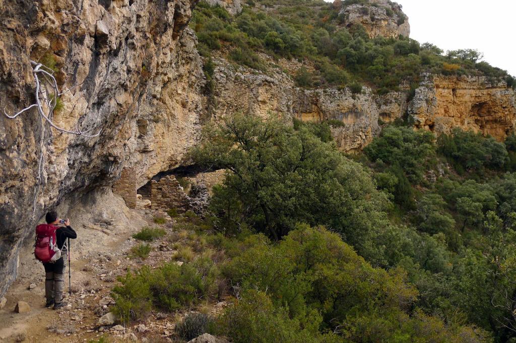 Aparcamos junto al mirador de Llimiana (780m) y, bajando por la carretera, tomamos un camino hacia al este señalizado con abundante pintura amarilla, en dirección a las ruinas de la ermita de Sant Andreu (889m 0h41′). El sendero, no muy bien acondicionado, faldea los cortados calizos de la sierra de la Vall de Llimiana, entre vegetación típicamente mediterránea y asomándose al valle que forma el barranc de Barcedana. Toda esta zona caliza es abundante en fósiles marinos. Pasamos por unos antiguos abrigos de pastores en la pared (809m 1h07′) y en el cruce de sendas (840m 1h33′) subimos hacia el norte teniendo que rectificar para descender hacia Sant Cristofol.