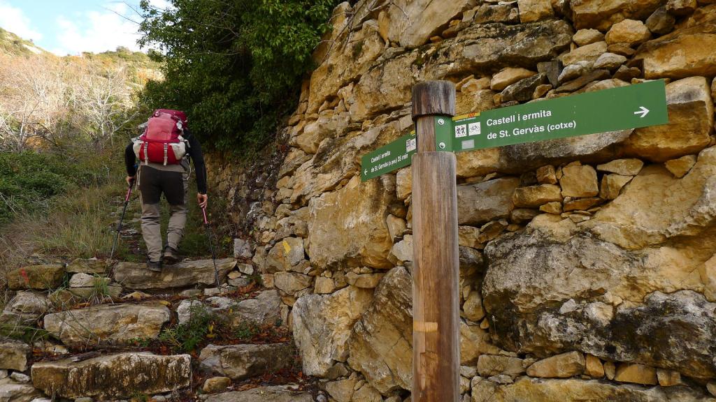 Tomamos la carretera vieja (760m 1h58′) que desemboca en la carretera asfaltada (771m 2h14′) que hay que seguir hasta el pueblo de Sant Miquel (825m 2h25′). A la salida del pueblo, tras pasar la iglesia, se toma la senda a la izquierda (845m 2h37′) subiendo hasta la pista donde están las ruinas del castel de Sant Gervàs (994m 3h00′) y la ermita de Sant Gervàs, unos metros más adelante y bien conservada. Hacemos un alto para almorzar bajo un agradable sol.