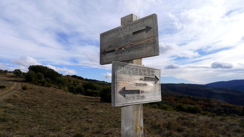 Volviendo al entronque de la senda con la pista subimos hacia el norte acercándonos a la sierra dels Obacs. Giramos hacia el oeste en la cota más alta del día (1081m 3h59′) y seguiremos esta dirección por pistas, obviando un par de bifurcaciones a la izquierda que bajan a Sant Miquel y a Sant Cristofol, terminando en un descenso con amplias lazadas que nos lleva a Llimiana (762m 5h32′)