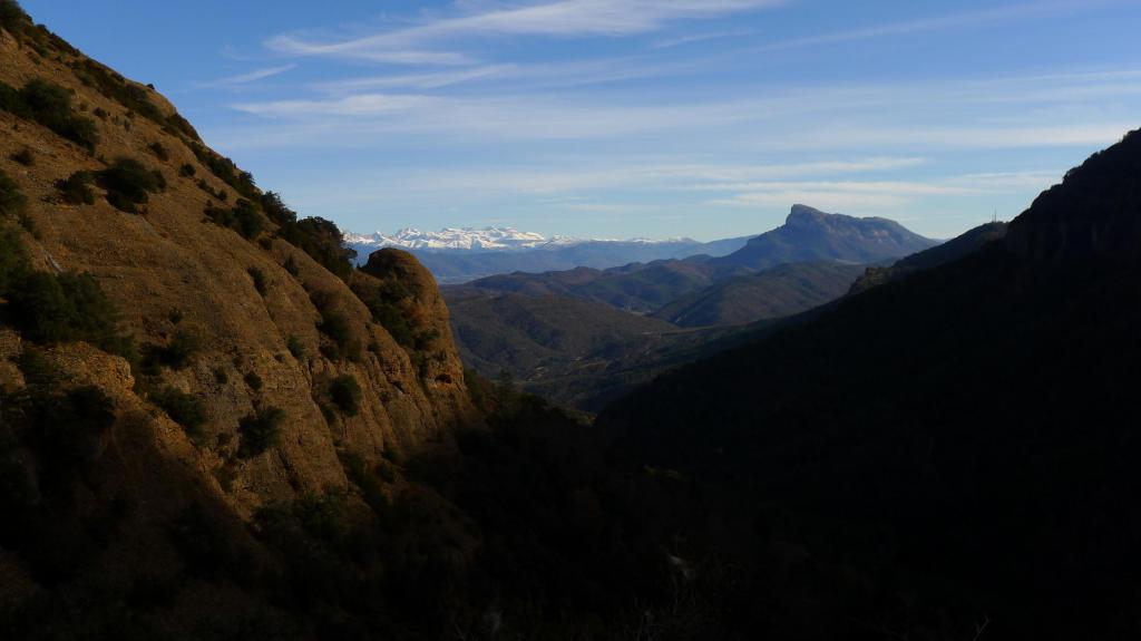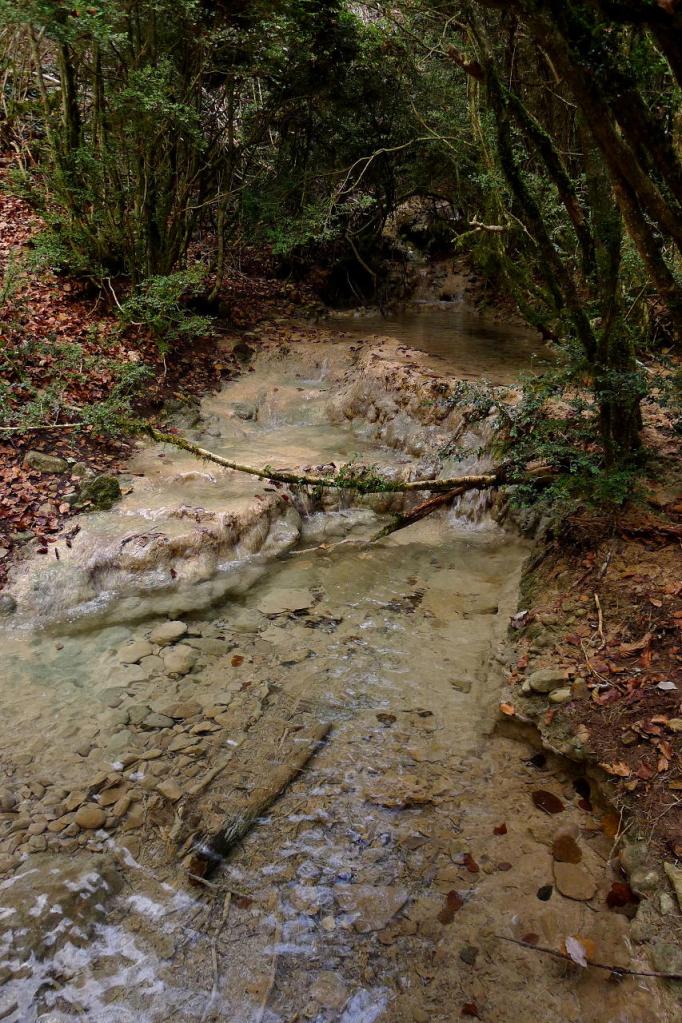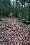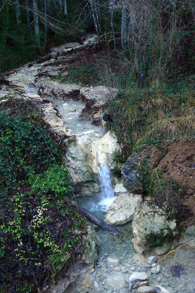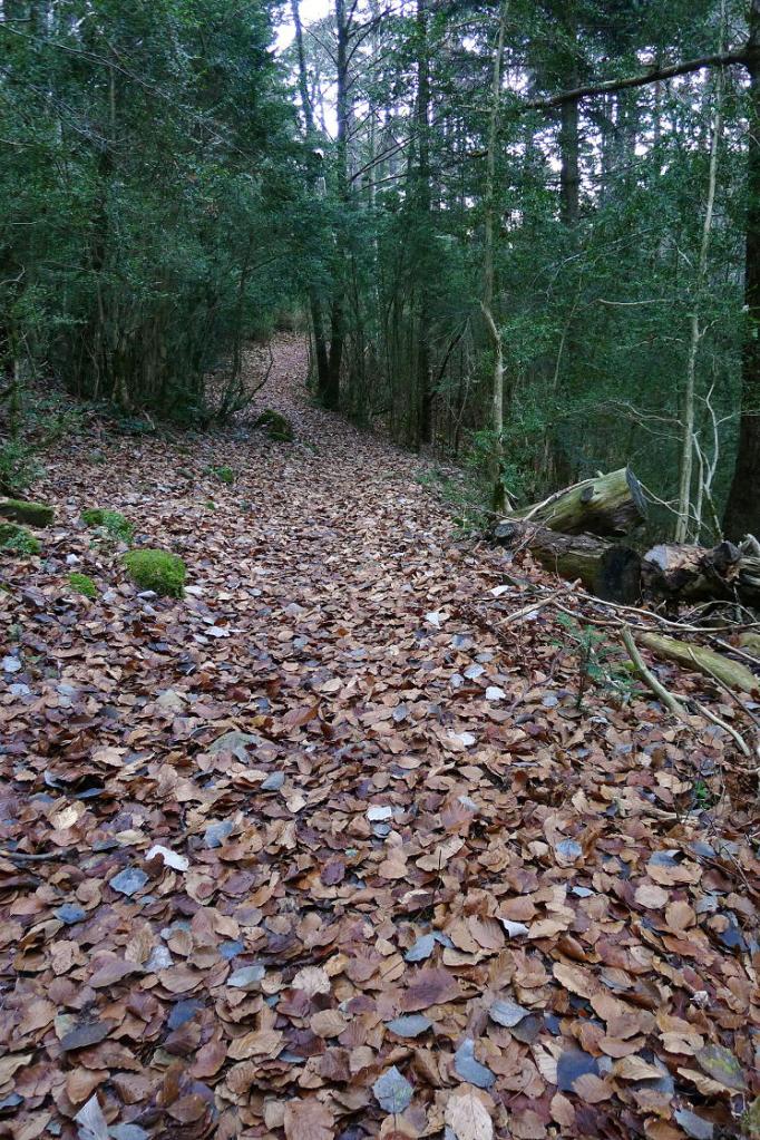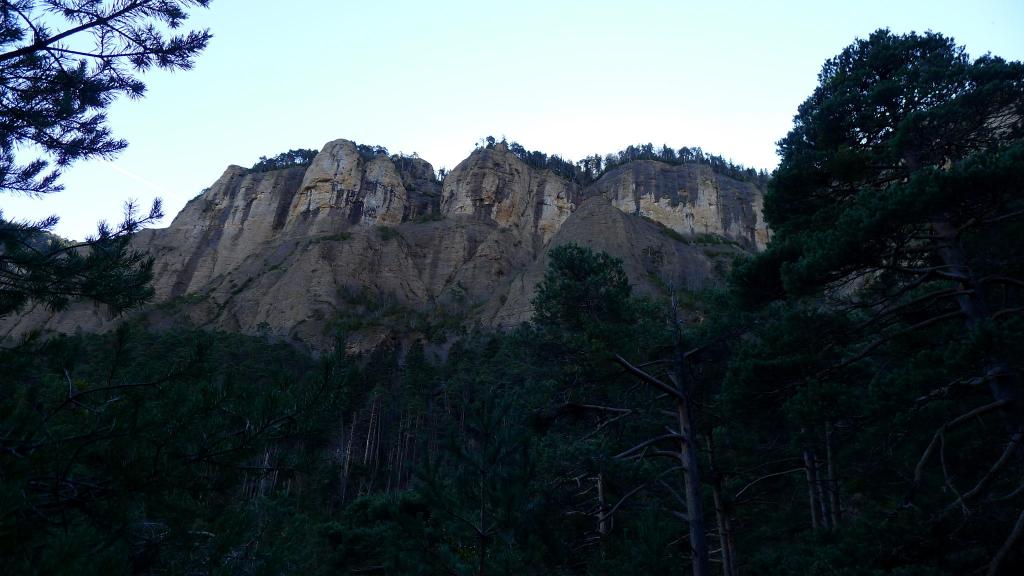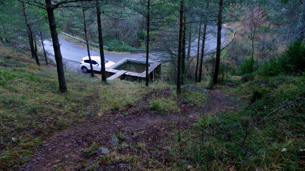 Junto al depósito, un poco escondido, se inicia el sendero por el bosque, subiendo decididamente y sin pérdida por un hermoso bosque, con sotobosque de boj y acebo y rodeado de altas pareces de conglomerados.
