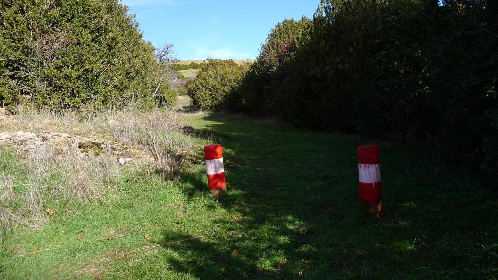 Ya cerca del collado hay una zona confusa, con algunos troncos caídos, pero empieza a haber hitos (1360m 0h32′) que clarifican la situación. A la bajada una pareja que va delante de mi se van por lo que parece senda hacia el sur (bajando hacia la derecha) y tengo que avisarles de que es una dirección equivocada.